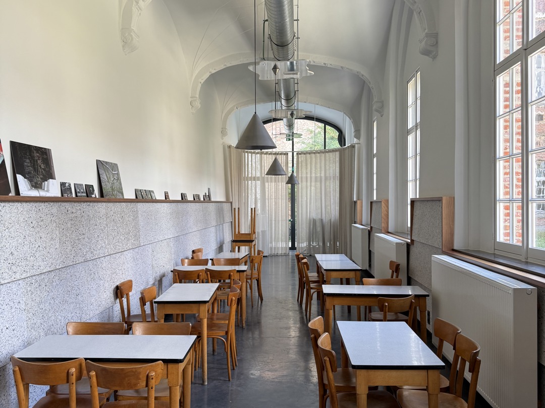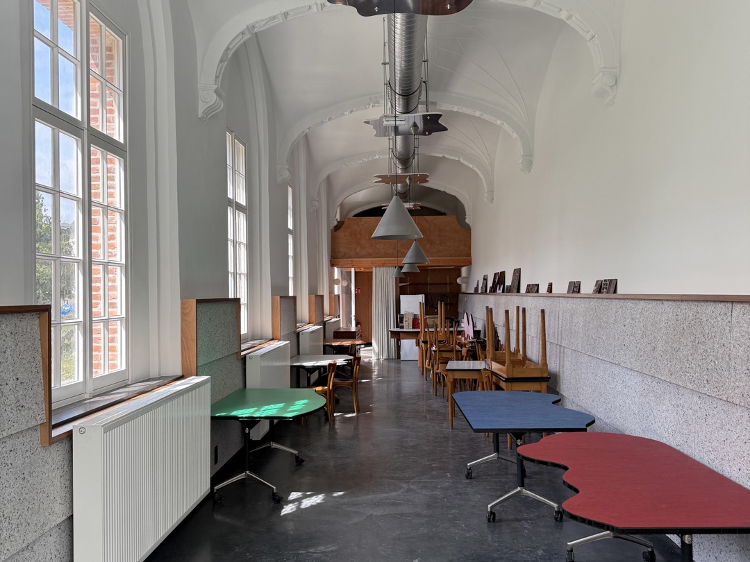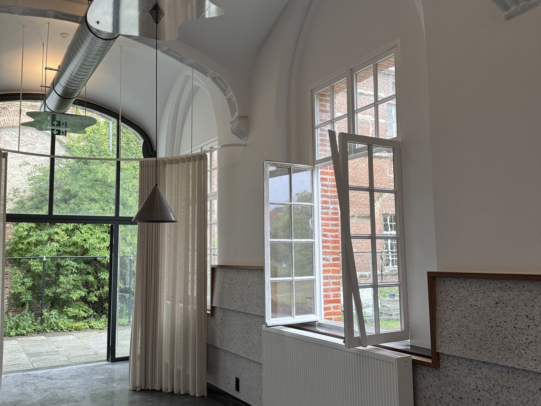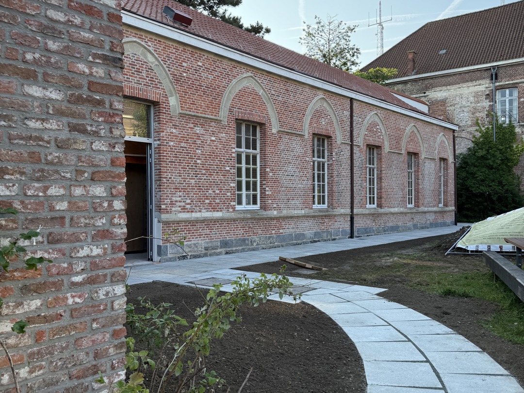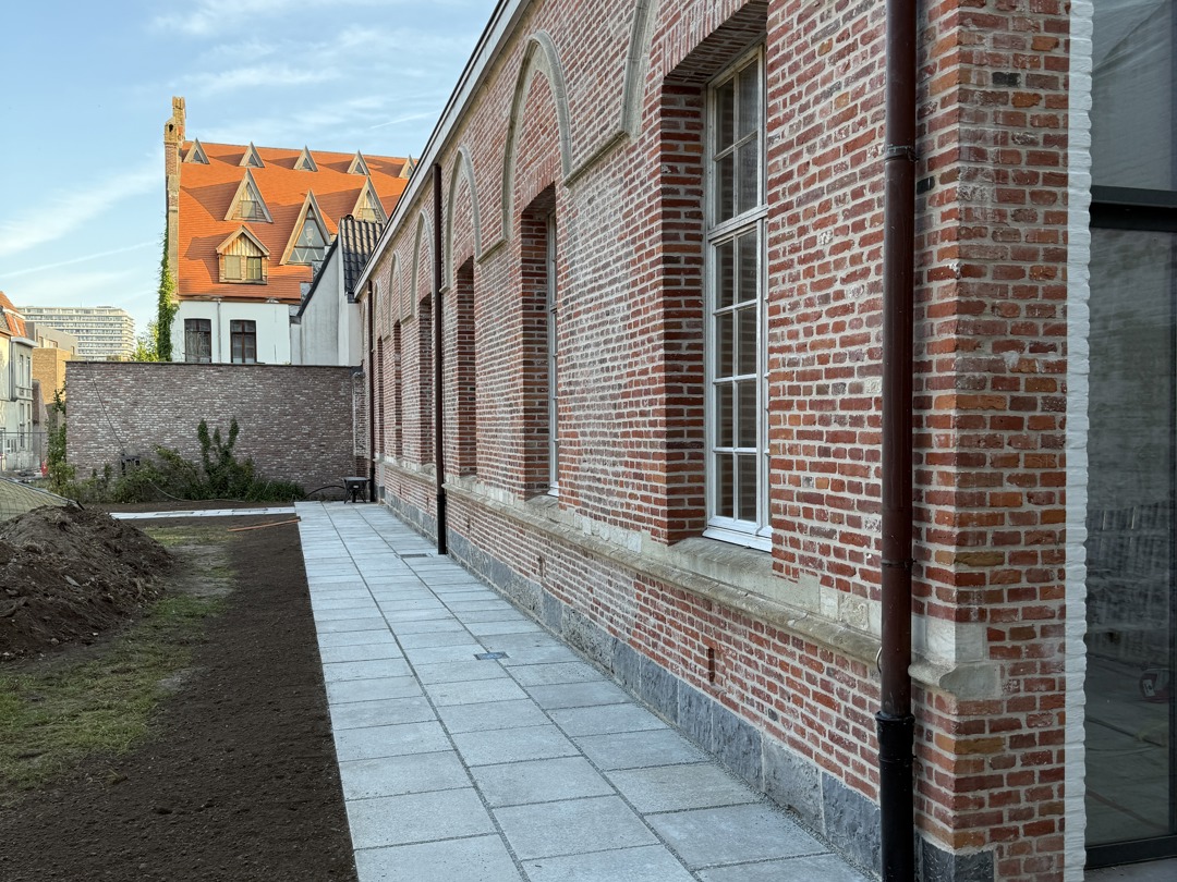 Doorzon interieurarchitecten koos ervoor om erfgoed en hedendaags gebruik subtiel te verbinden. Zo werden voor het terras hergebruikte tegels ingezet die ooit het Sint-Baafsplein sierden. Waar ze daar niet bestand waren tegen zwaar verkeer, krijgen ze nu een tweede leven als duurzame ondergrond voor buurtactiviteiten. Het resultaat is een plek die historische waarde ademt en tegelijk alle faciliteiten biedt om er te vergaderen, te koken of gewoon samen te zijn.