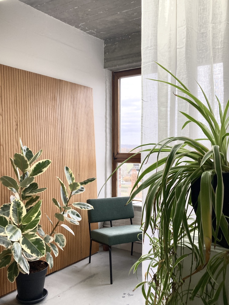Naast de werk- en vergaderruimtes kreeg ook de ‘living’ een duidelijke eigen sfeer. Hier werd bewust gezocht naar rust en intimiteit, met tweedehands eiken akoestische panelen, een oude zetel en zelfgemaakte gordijnen. De materialen brengen warmte in de ruimte zonder het industriële karakter uit te wissen. Het resultaat is een plek waar overleg en pauze samenvallen, los van de dynamiek van het open kantoor.
