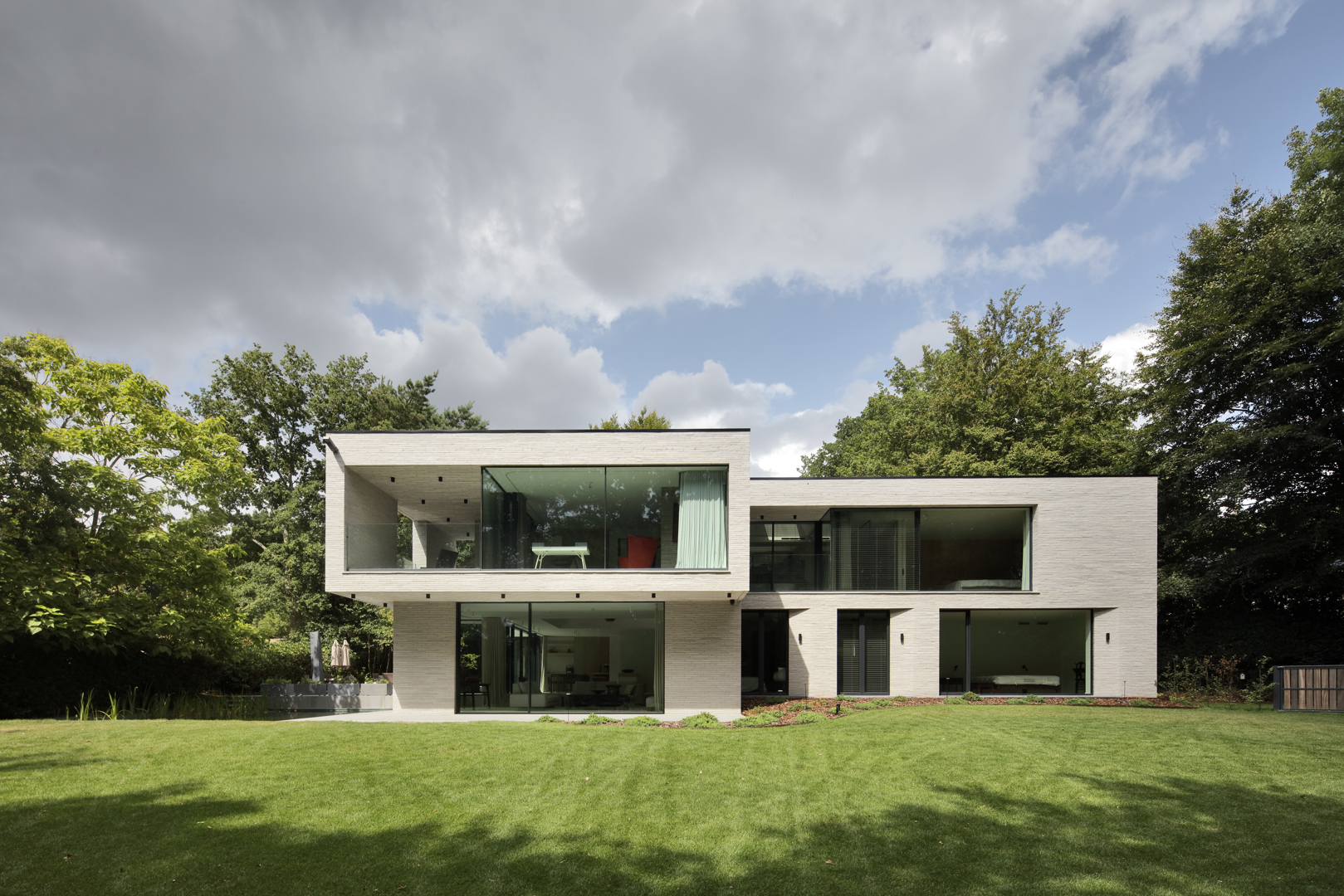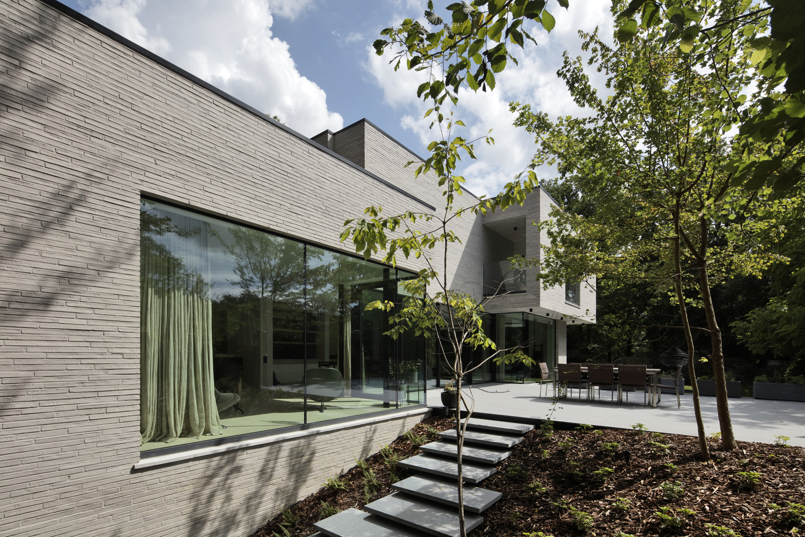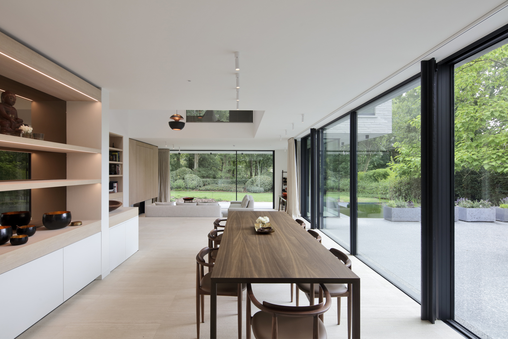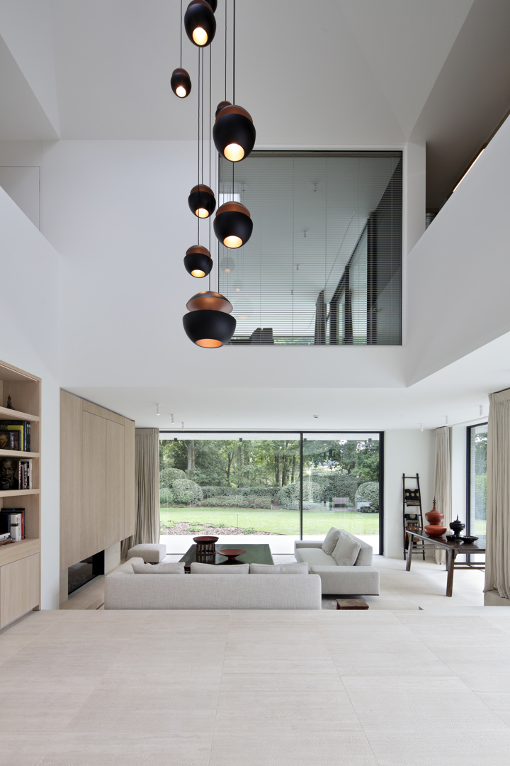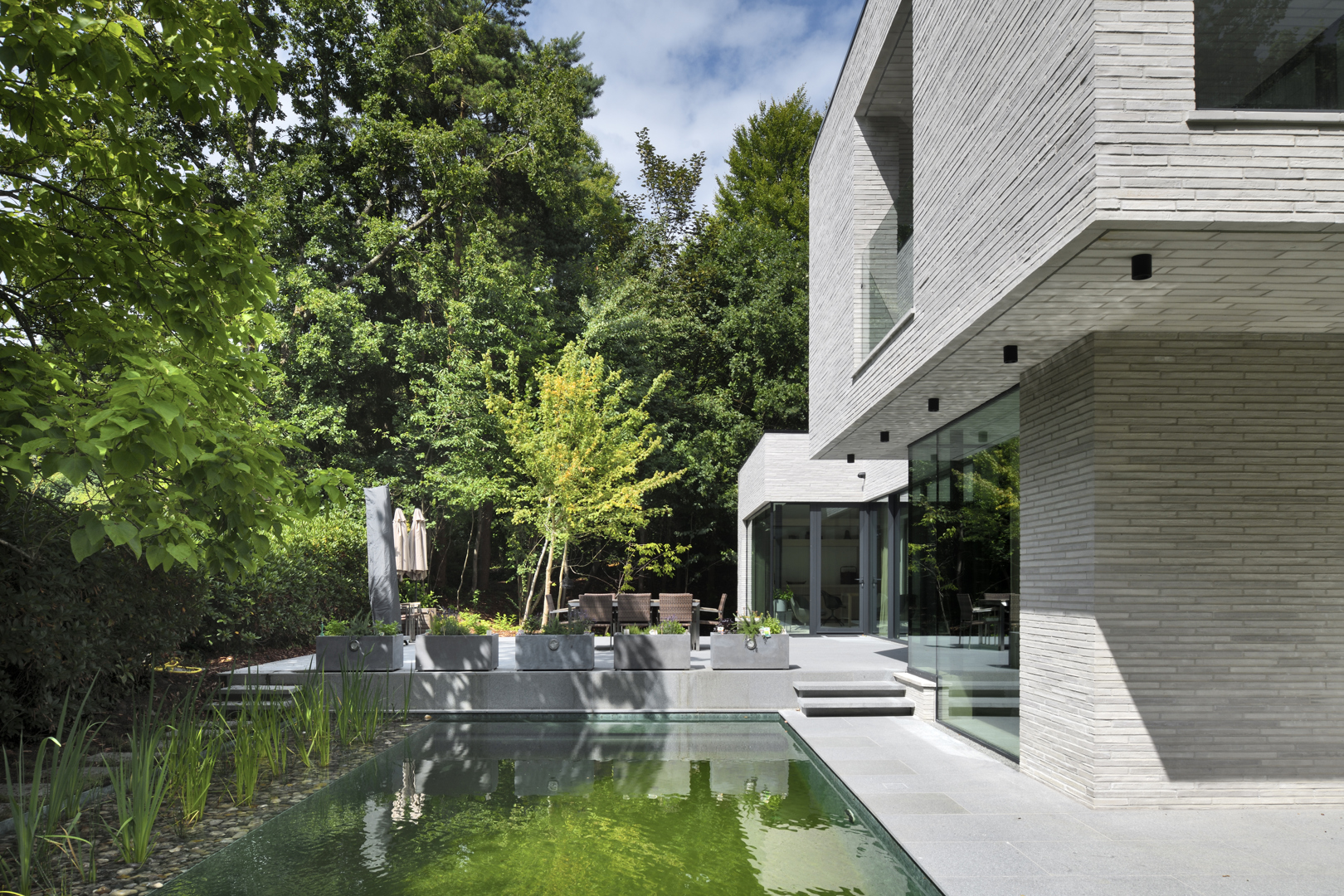 Ook de tuin werd ontworpen als verlengde van het architecturale concept. Het perceel wordt omzoomd door volwassen eiken en beuken, aangevuld met een beplanting die inheemse soorten combineert met subtiele Aziatische accenten zoals Japanse kornoeljes. De zwemvijver, het minimalistische tuinhuis en de padoek overkapping vervolledigen het ensemble. Zo ontstaat een woning waarin architectuur, interieur en landschap in één samenhangend verhaal worden gebracht.