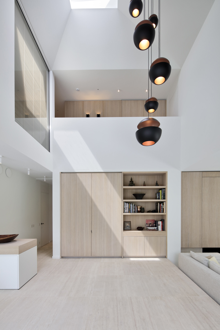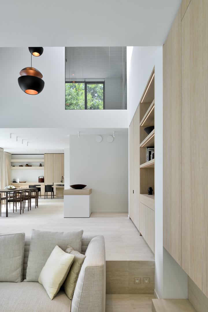 Het interieurconcept vertrekt vanuit de affiniteit van de bewoners met Aziatische cultuur. Samen met Philip Simoen werd gekozen voor een ingetogen en warm materialenpalet, opgebouwd uit gebouchardeerde travertijn, eiken parket en maatwerkkasten in gezandstraald eikenfineer. Zachte tinten en natuurlijke texturen creëren een rustige achtergrond waarin kunst en verzamelobjecten subtiel worden geënsceneerd.