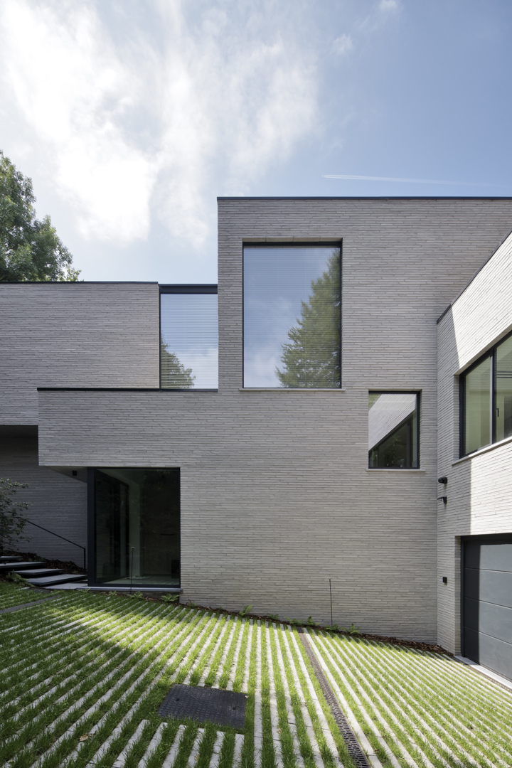 Waar de vroegere woning werd gekenmerkt door witgeschilderde baksteen en hellende daken, introduceert de renovatie een volledig nieuwe, strak vormgegeven gebouwschil. De slanke, lichtgrijze baksteen en uitgepuurde detaillering geven de woning een ingetogen uitstraling. Grote aluminium raamopeningen aan zuid- en westzijde openen het volume naar de tuin en zorgen voor een maximale lichtinval.