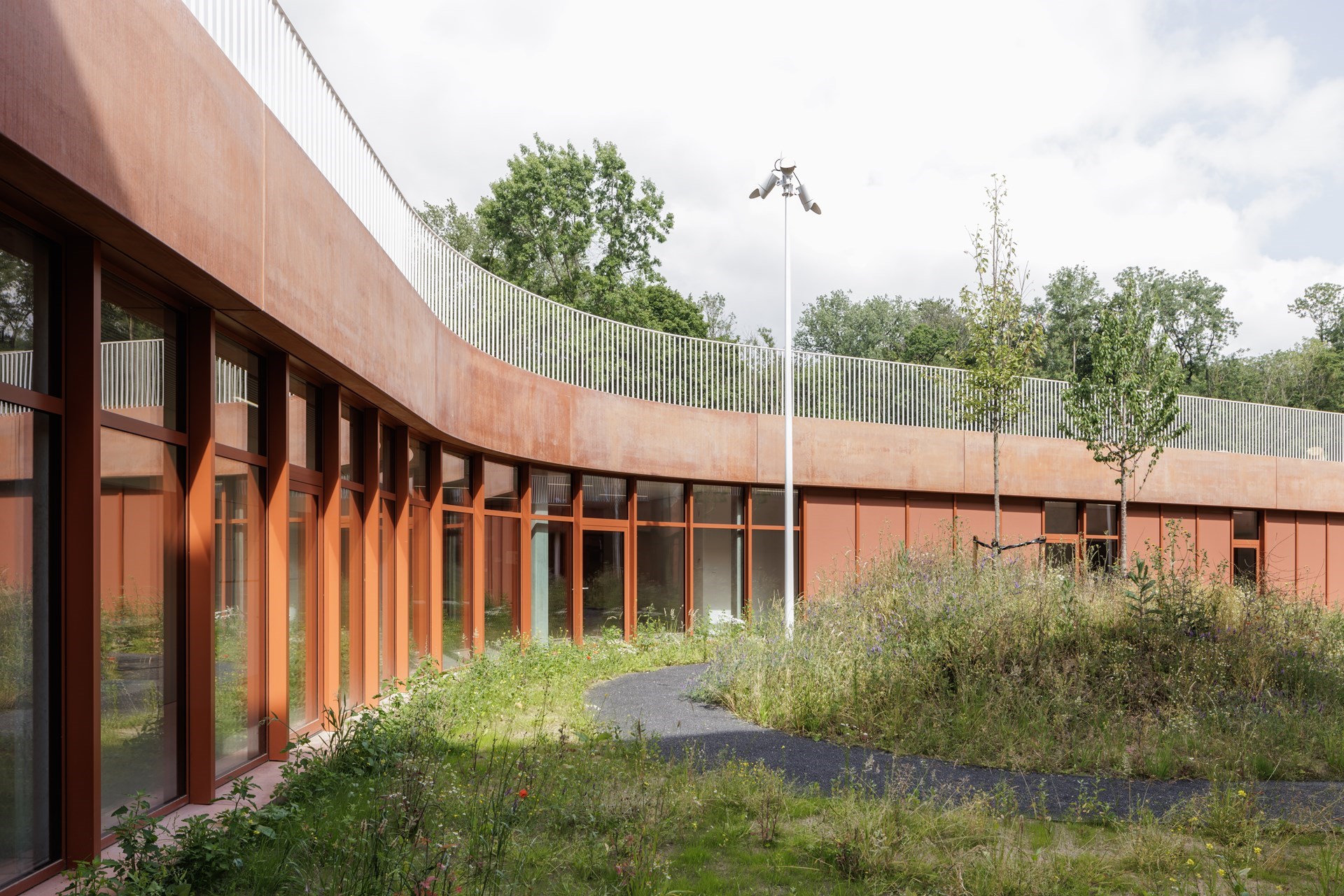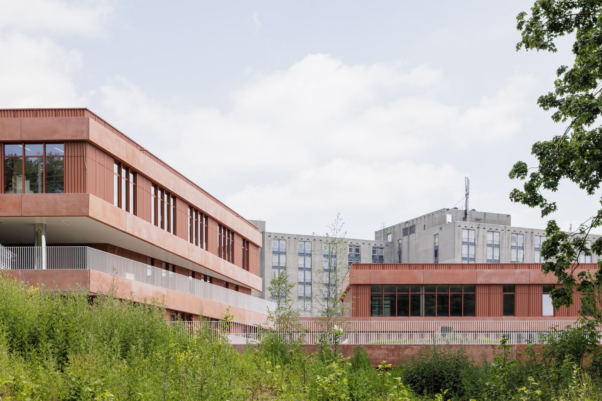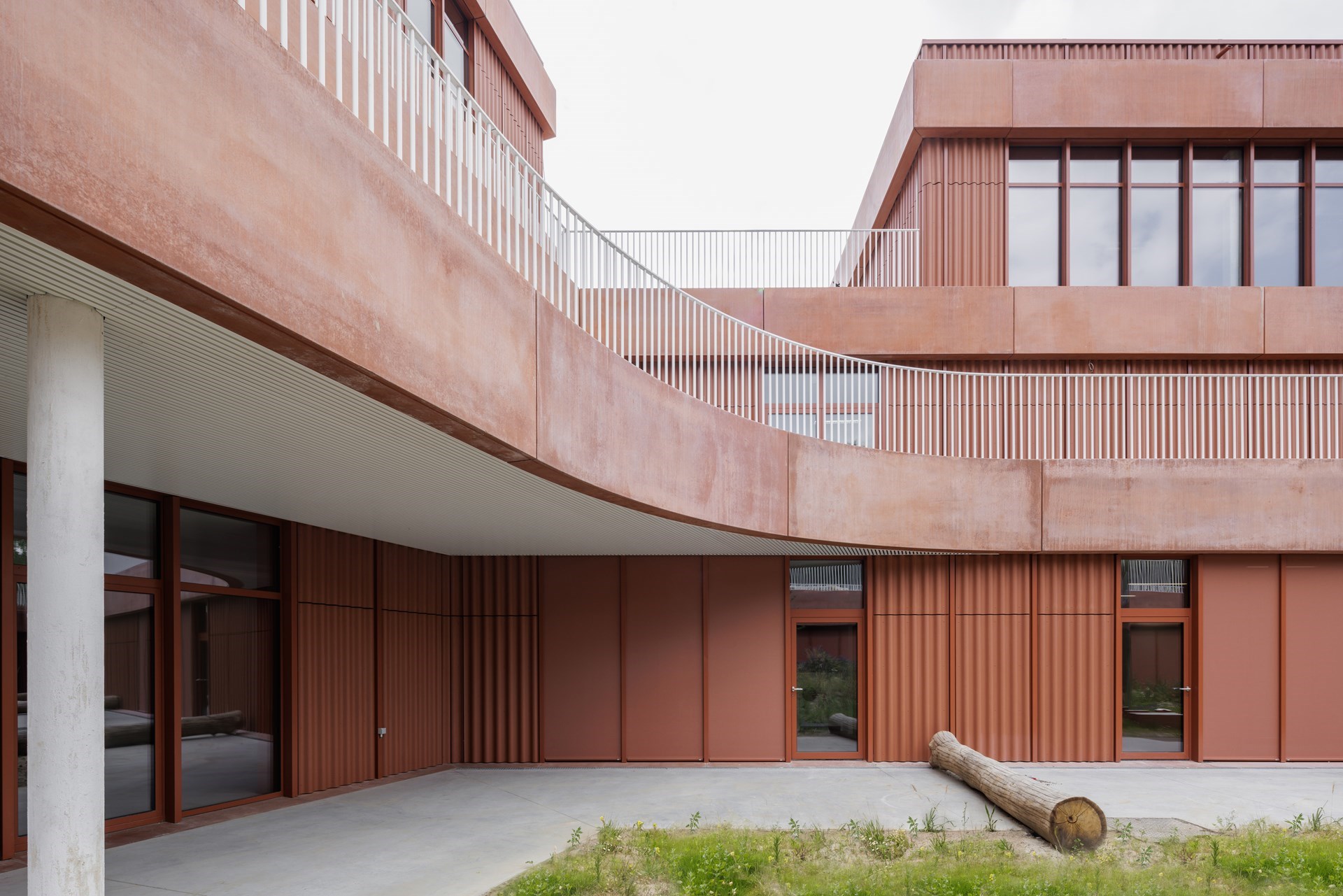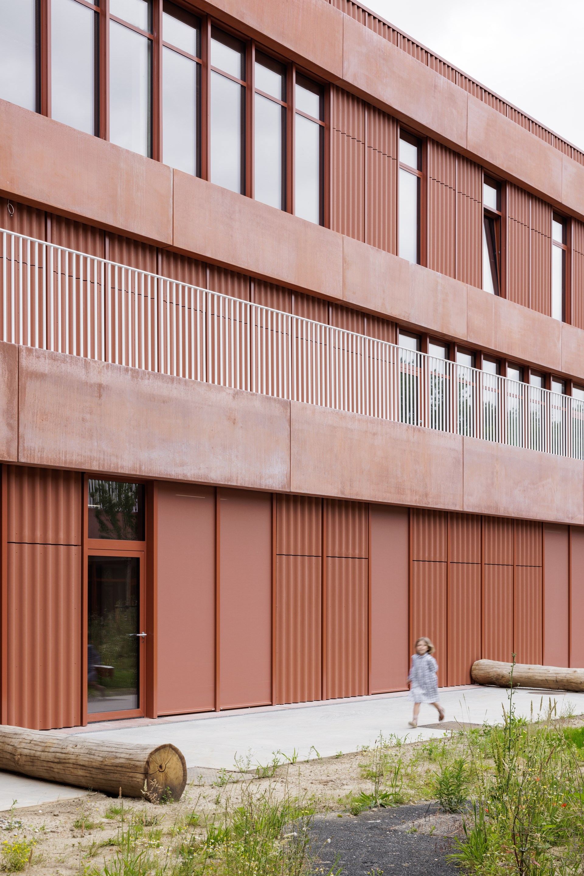 Het gebouw zelf heeft een compacte structuur met een vrije invulling voor maximale flexibiliteit. De daken fungeren als groendaken en als verharde en niet-verharde speelplaatsen om de impact op de grond te verkleinen. Het materialenpallet werd, ook in functie van de duurzaamheidskeuzes en de hoge akoestische eisen, afgestemd op die integrale beleving: warme, duurzame en onderhoudsarme materialen in een aangenaam kleurenpallet geven de campus haar eigenheid.