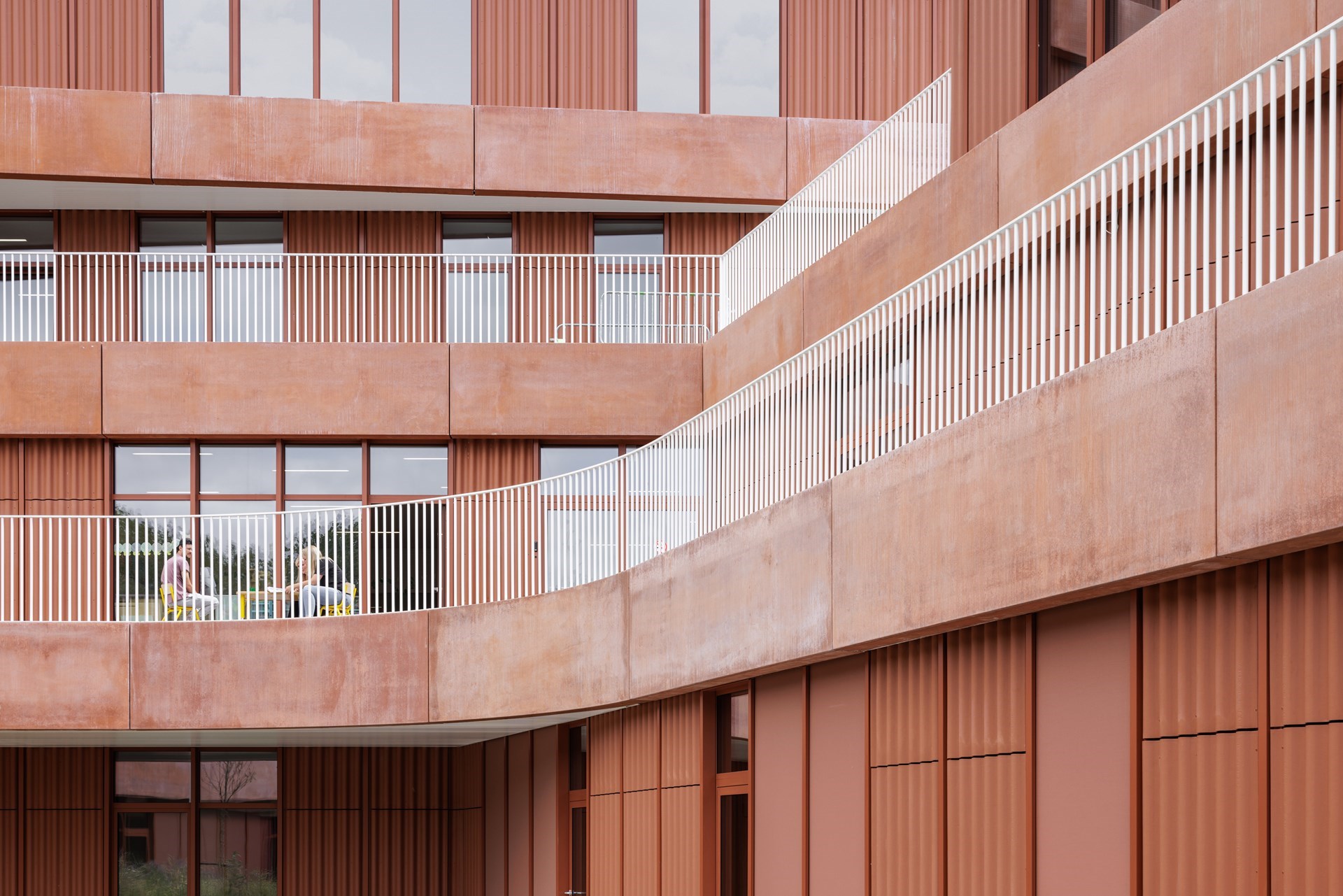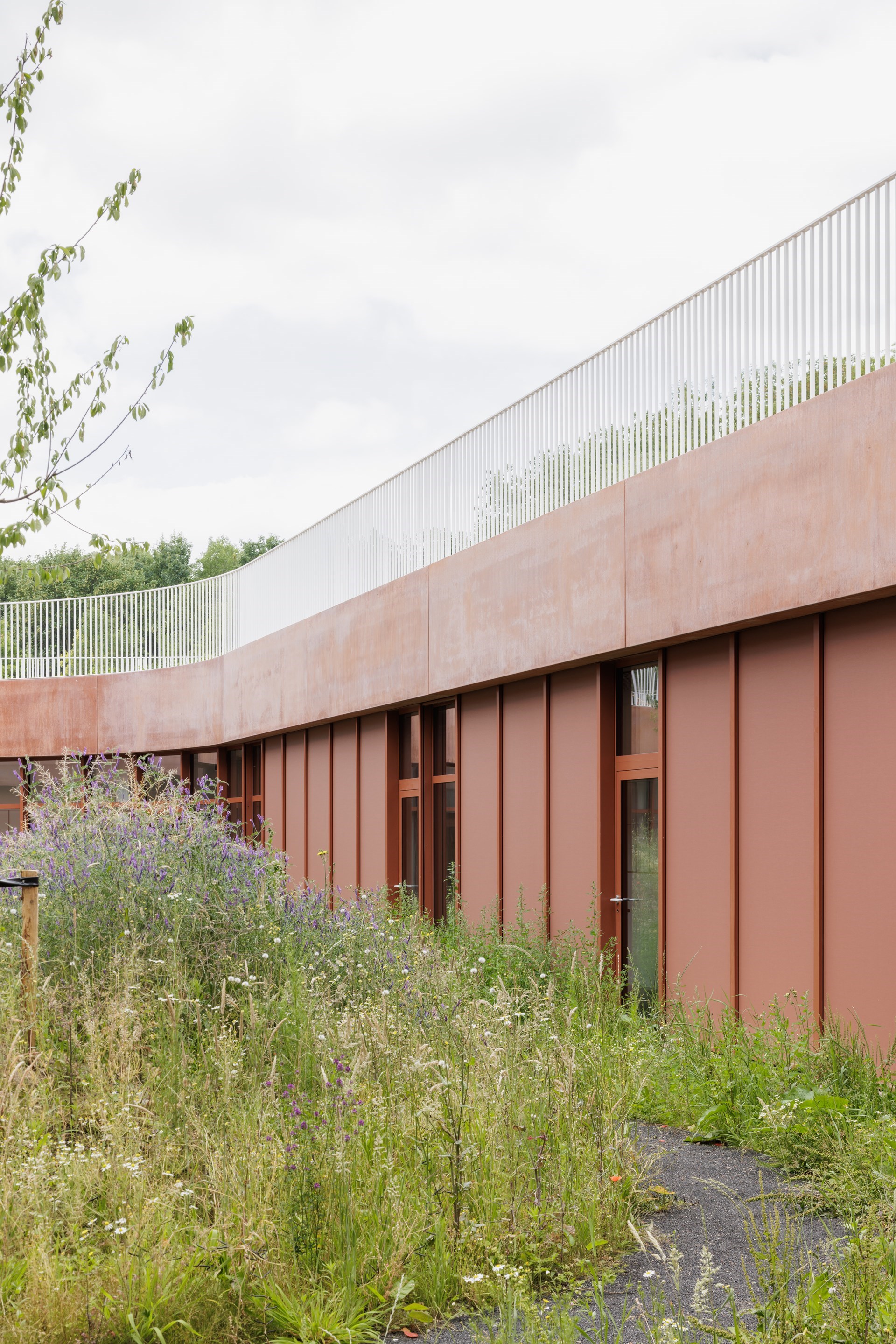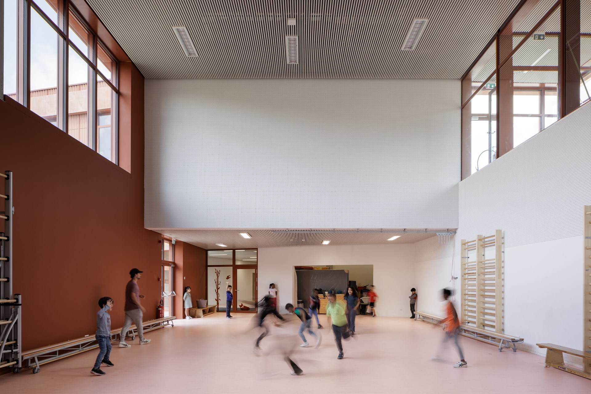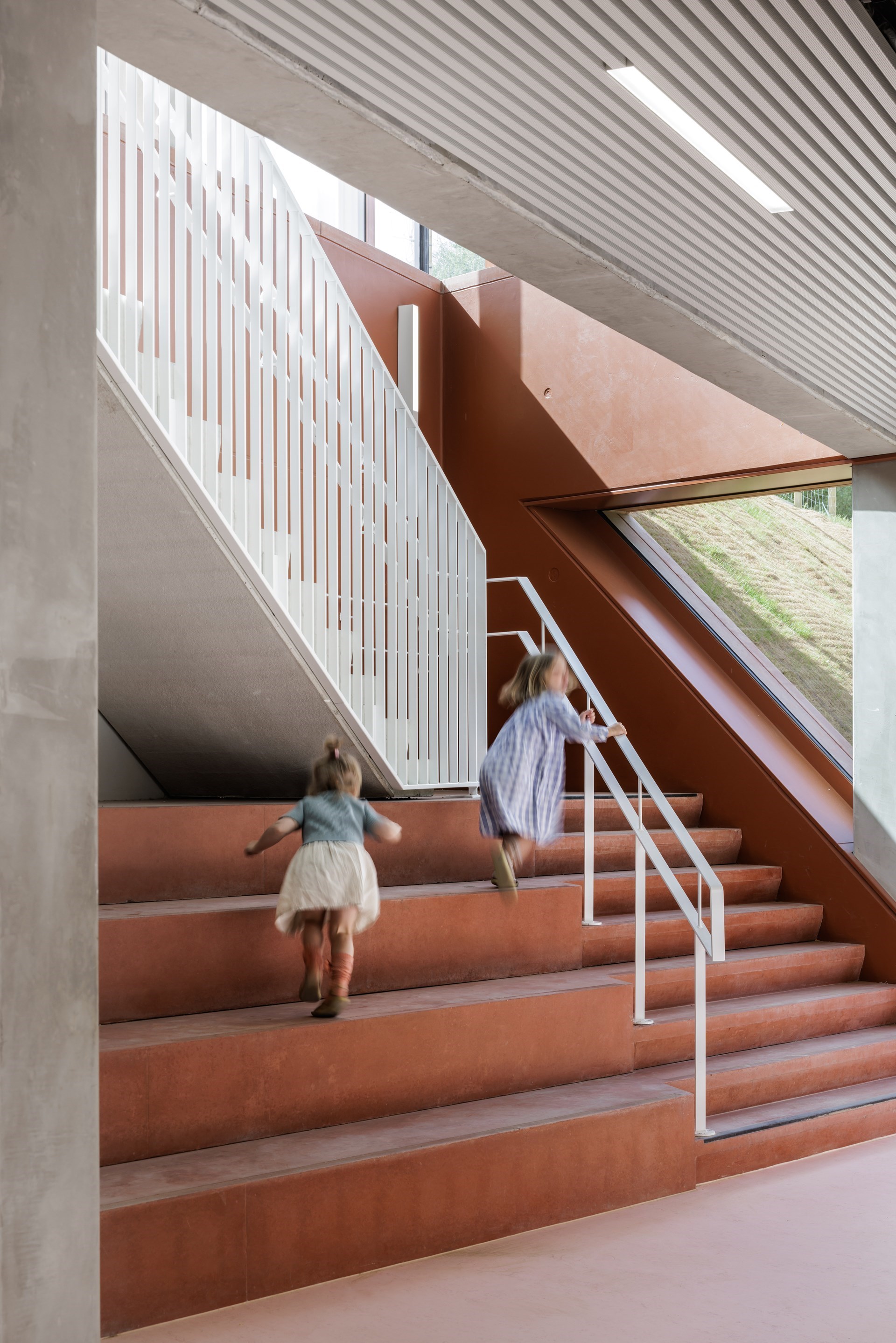 Het gebouw zelf heeft een compacte structuur met een vrije invulling voor maximale flexibiliteit. De daken fungeren als groendaken en als verharde en niet-verharde speelplaatsen om de impact op de grond te verkleinen. Het materialenpallet werd, ook in functie van de duurzaamheidskeuzes en de hoge akoestische eisen, afgestemd op die integrale beleving: warme, duurzame en onderhoudsarme materialen in een aangenaam kleurenpallet geven de campus haar eigenheid.