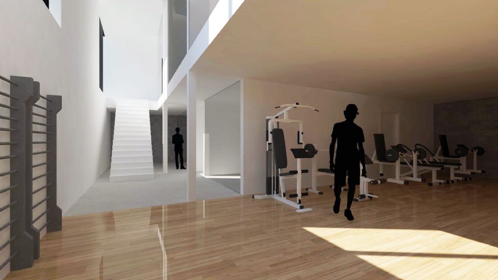 Op het gelijkvloers zijn er kleedkamers, kitchenette, behandelruimte en de oefenruimte. De toegang tot het bovenliggend appartement gebeurt aan de zijgevel, waardoor er geen kruising is in looplijnen tussen bewoners en patiënten of personeel.