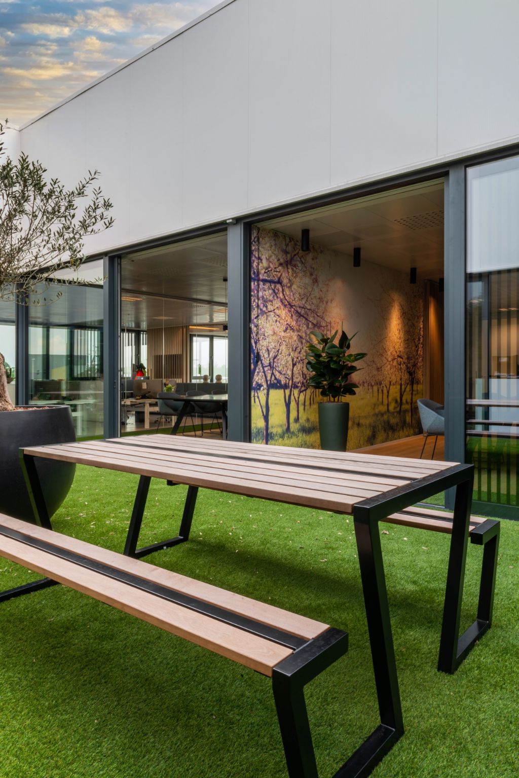 De verbinding met de natuur vormde dan ook een belangrijk uitgangspunt voor het ontwerp van dit kantoorgebouw. De vergaderruimtes in het verlengde van de centrale patio komen dankzij de verbindende lijn van buitenlicht los van de industriële inborst van het gebouw. De patio zorgt voor een buitenruimte waar elke medewerker of bezoeker tot rust kan komen. De kantoormedewerkers kijken uit op de glooiende fruitplantages en genieten buiten van een rustige en groene sfeer, weg van alle bedrijvigheid. En ook bezoekende vrachtwagenchauffeurs krijgen als bestemming een open en fris gebouw, waarvan de brede glazen voorgevel hen als een vertrouwd gezicht begroet.