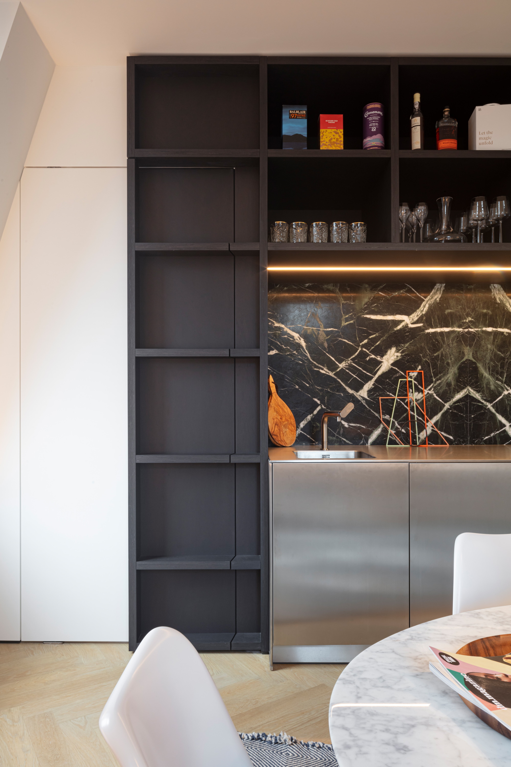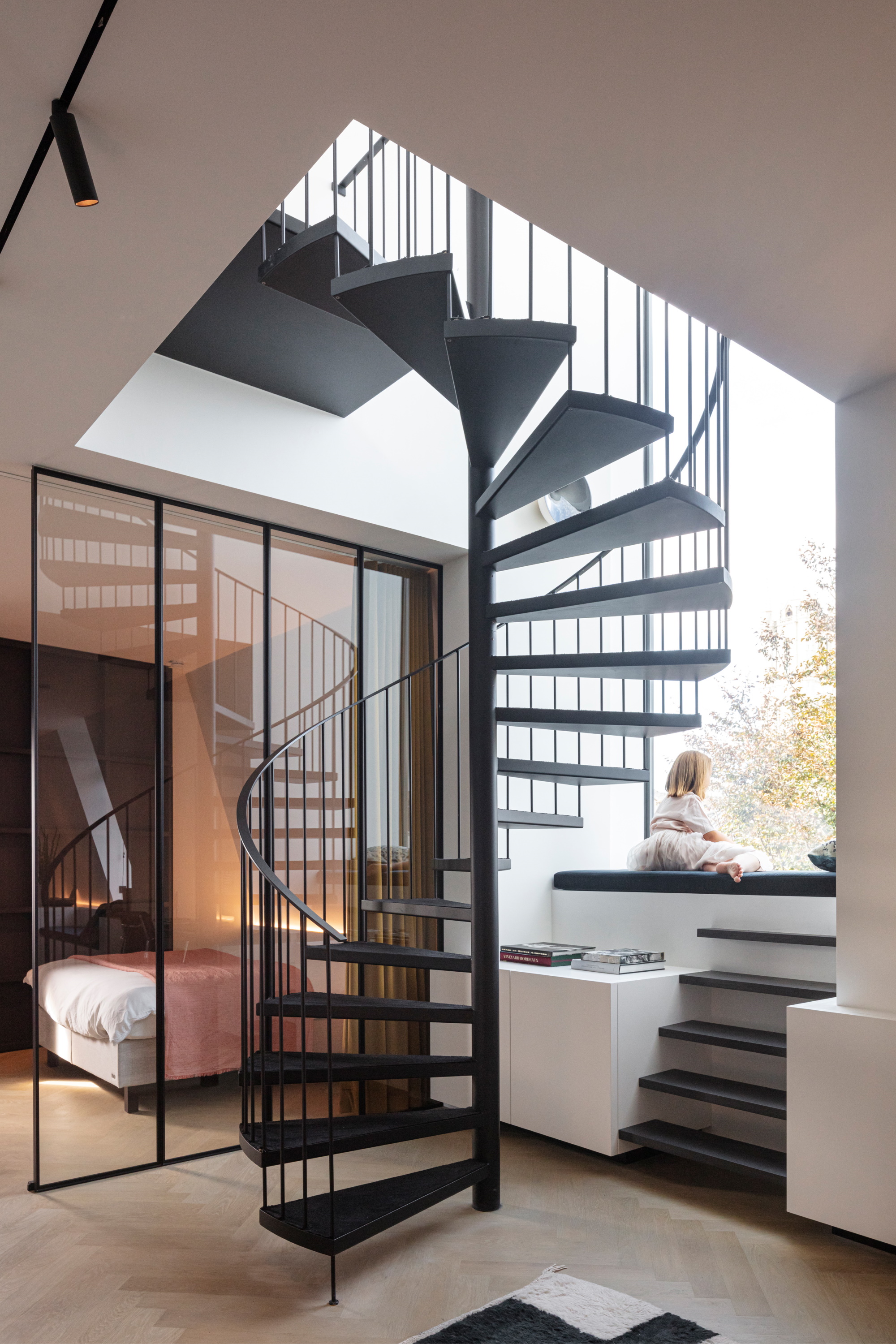 De lichtinval in het herenhuis zorgt ervoor dat de architecturale keuzes geaccentueerd worden. Ook het contrast tussen lichte en donkere elementen wordt nog duidelijker in het penthouse van Peter Moerman op de bovenste verdiepingen. Tussen de witte muren en zwarte raamkaders, lichtarmaturen en traptreden zorgen kunst en design er voor subtiele kleuraccenten. Ook de glaspartij van zes meter hoog is er een architecturaal statement. Die heldere glaspartij volgt de matzwarte draaitrap naar de bovenste verdieping waar een buitenterras zicht biedt op de Drie Torens van Gent en het water van de Reep.