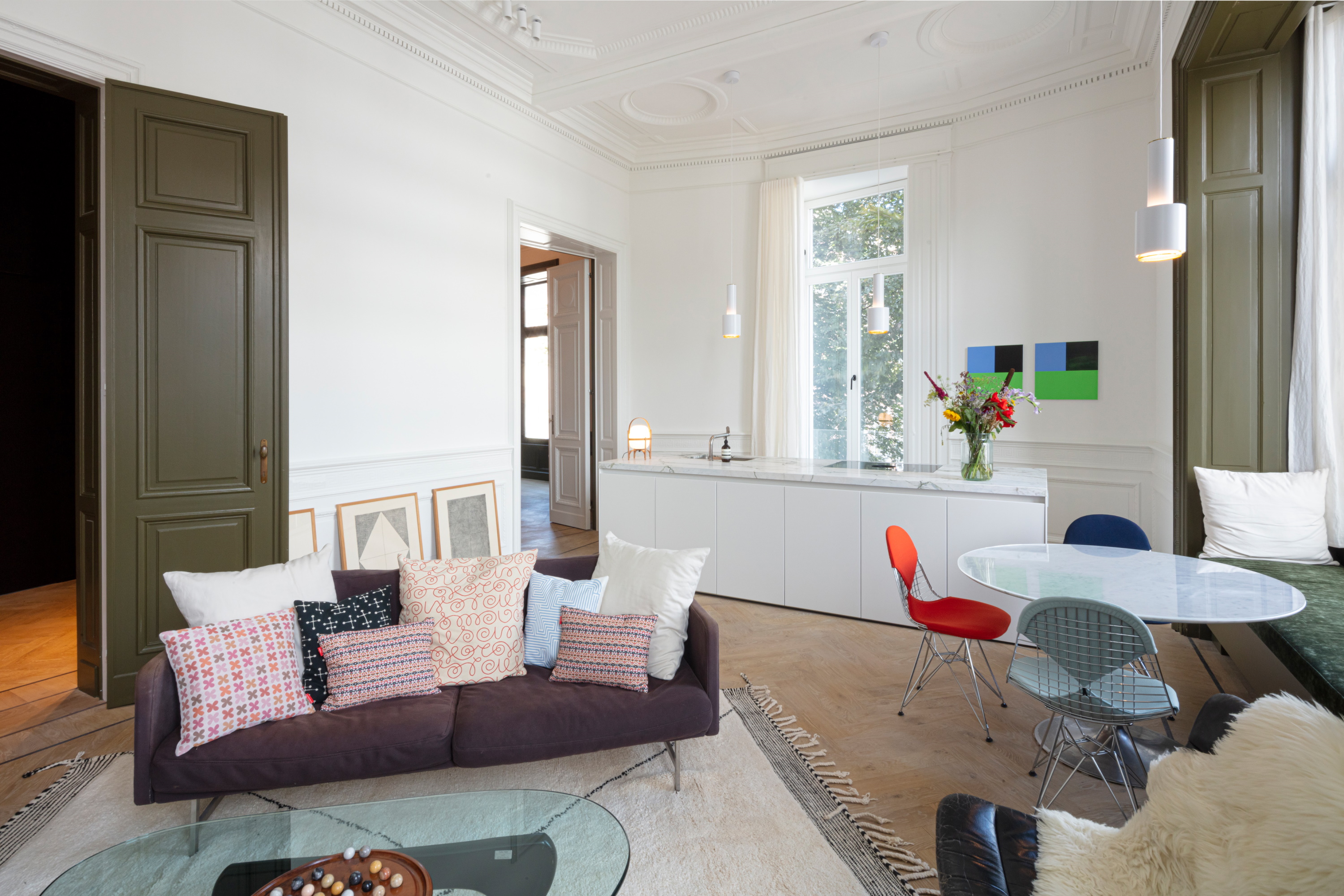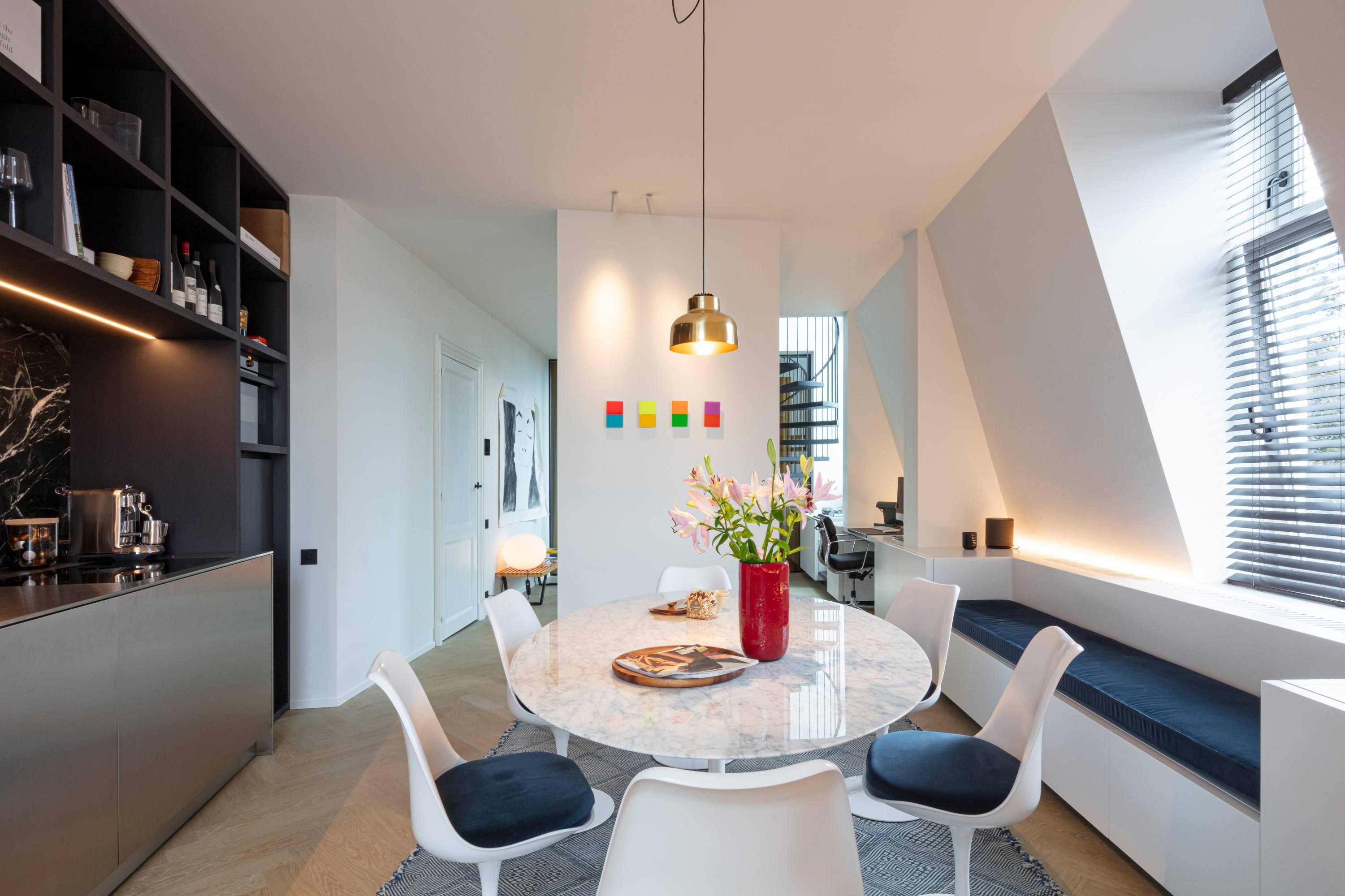Een voorbeeld daarvan zijn de kleurrijke stoelen die rechtstreeks uit de jaren zestig lijken te komen in het appartement van Thomas Moerman op de eerste verdieping. Samen met de abstracte schilderijen op de muur zorgen ze voor een kleurrijk interieur in de open en lichtrijke ruimte. Toch voert het kakigroen geschilderde, originele schrijnwerk van de ramen en deuren de boventoon op de eerste etage waardoor verleden en toekomst er vloeiend in elkaar overgaan.