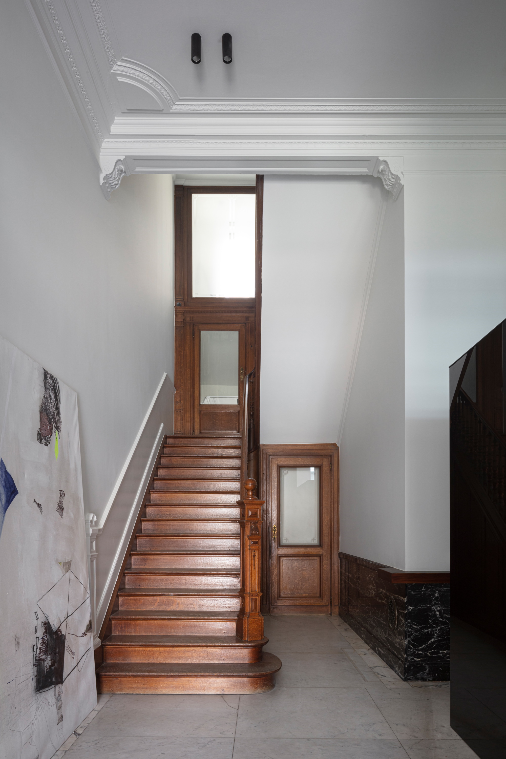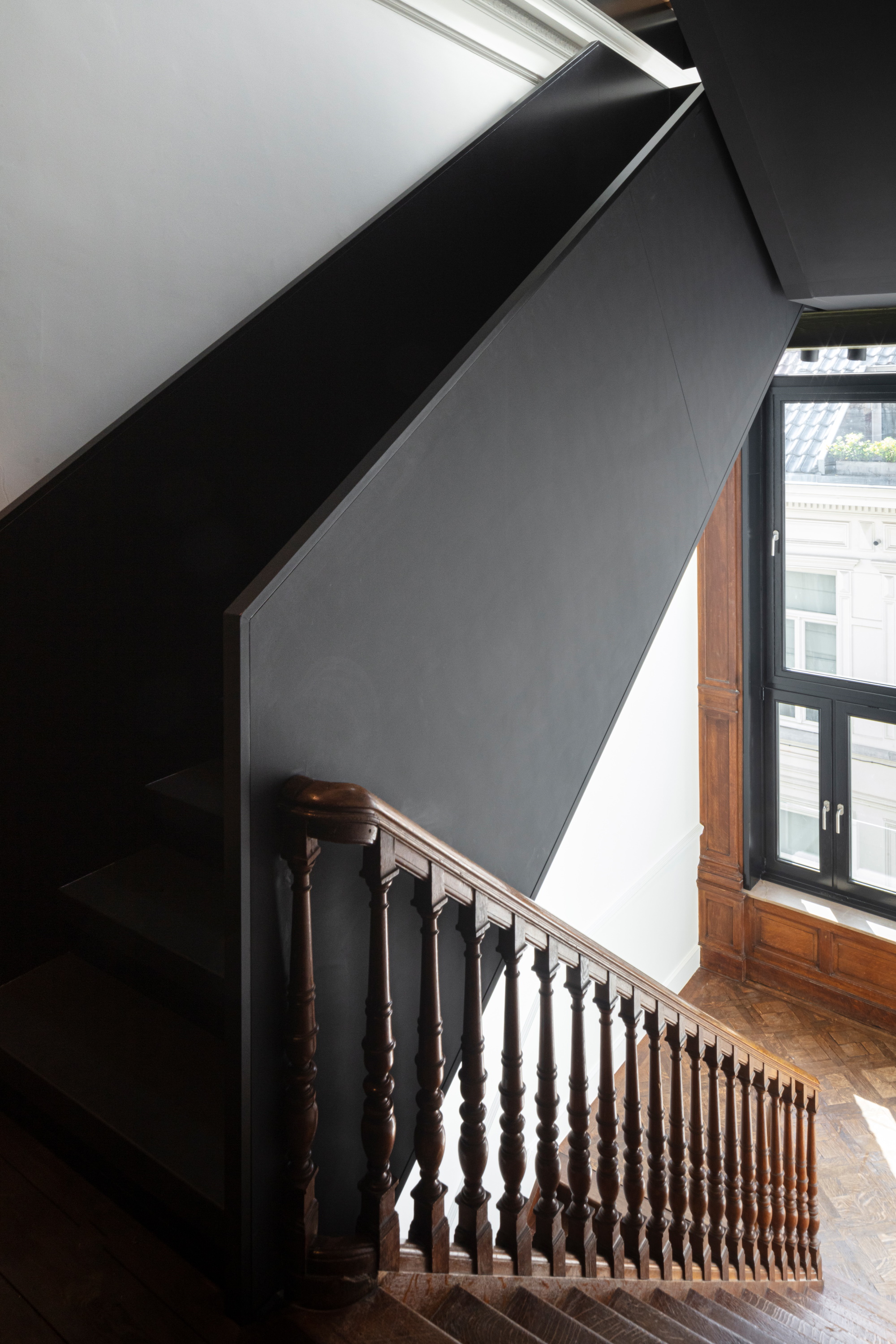 Ook in de traphal verzoenen de twee broers en CAAN Architecten het verleden en de toekomst. Dat doen ze door de traphal een strak architecturaal element te geven, typisch voor de mannen achter Rietveldprojects. Het contrast tussen de antieke, massief eiken trapleuning die uitmondt in een strak, zwart vervolg kan haast niet groter zijn.