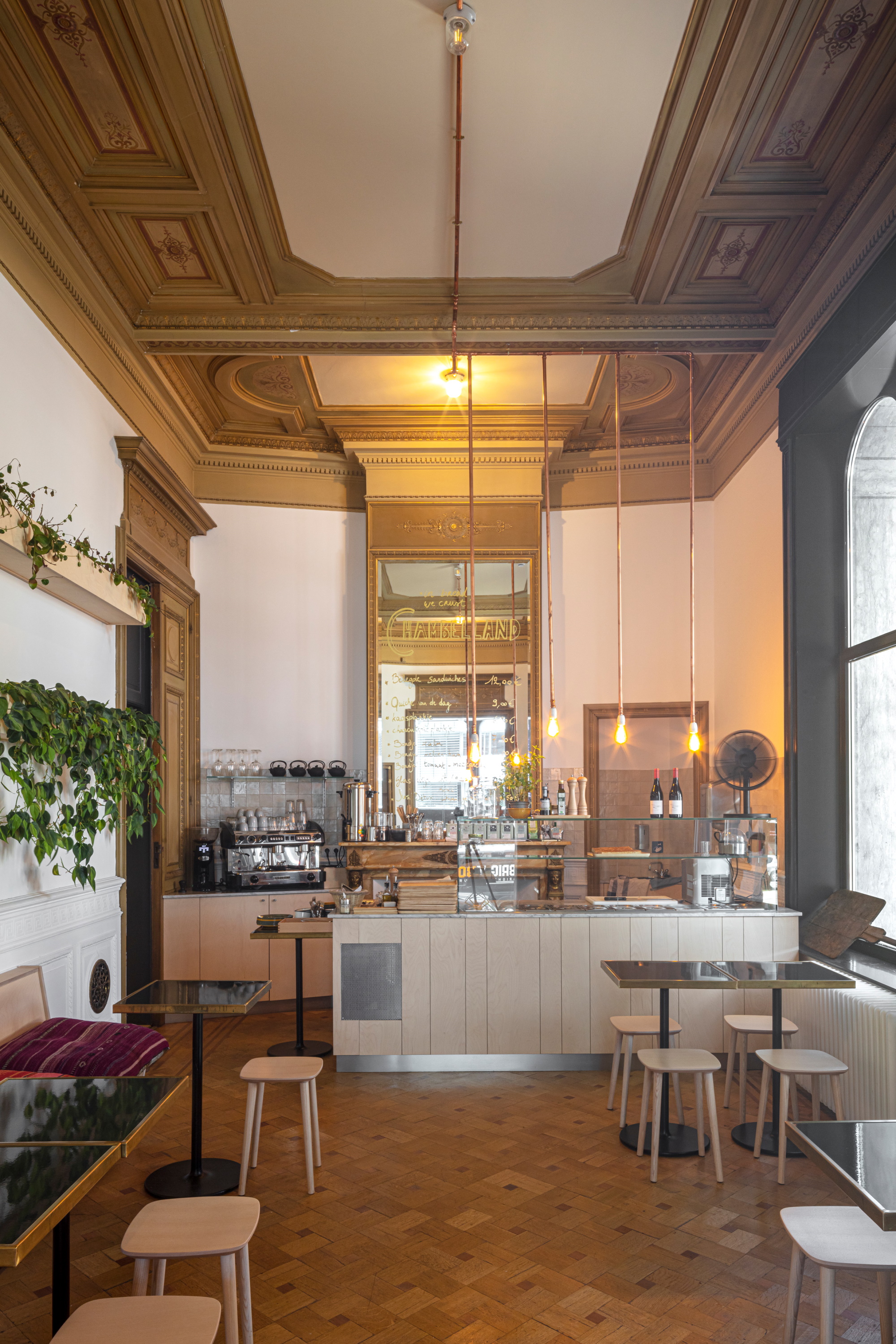 De traditionele elementen van het gebouw zijn bijna niet veranderd. De witgeschilderde plafonds en muren zetten zelfs de marmeren schouwen extra in de verf. In de vierenhalve meter hoge ruimtes ligt een klassieke, massief eiken visgraatparket dat dan weer voor warmte zorgt in het geheel. Naast de originele aspecten is het pand verrijkt met moderne en vintage design- en kunstelementen.