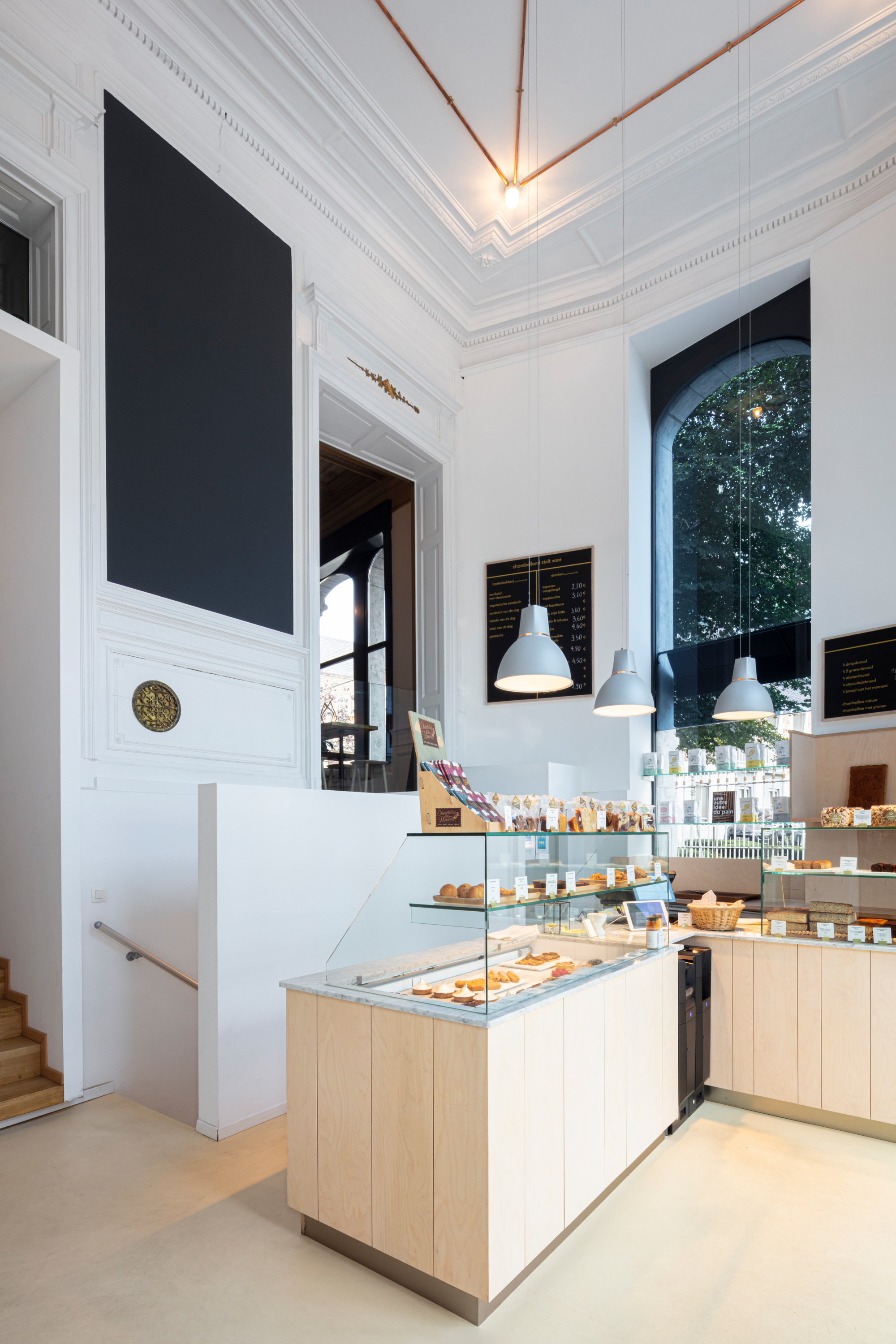 Op het gelijkvloers kan iedereen een voorproefje krijgen van het interieur van de rest van het Rietveldhouse, want de biologische bakkerij Chambelland is vrij te bezoeken. Daar zijn al enkele raamkaders te zien in zwart metaal, een materiaal dat nog veel terugkomt in de rest van de vakantiewoning. Het originele plafond met de vergulde moulures is behouden en de inkomhal is volledig gerestaureerd. De muren zijn er spierwit om de authentieke details van de woning alle aandacht te geven.