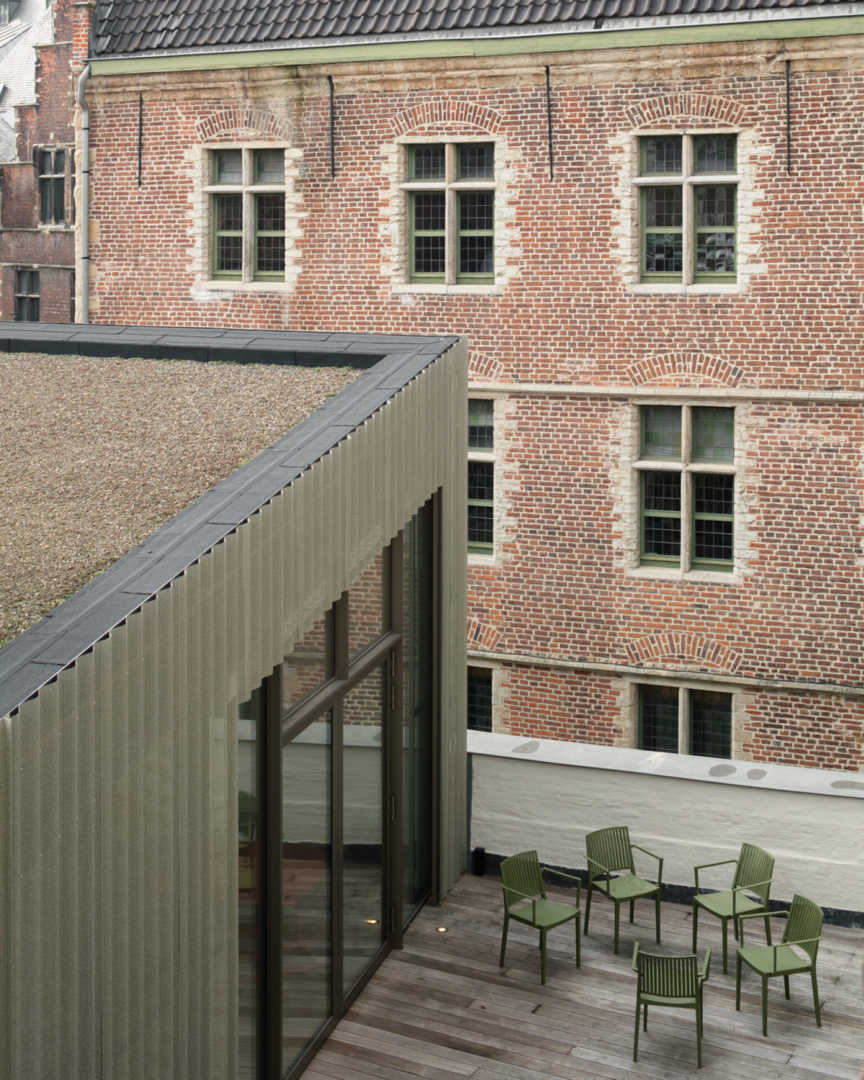 De bestaande achterbouw had geen historische waarde en werd volledig gesloopt om plaats te maken voor een nieuwbouwvolume. Dit nieuwe deel herbergt de ondersteunende functies en technieken, zoals een cafetaria, een fietsenberging en technische dienst, waardoor het hoofdvolume ontlast wordt. De ingreep maakt de historische achtergevel opnieuw zichtbaar en brengt lucht en zonlicht in het binnengebied. Verder heeft het project een kleine binnentuin, een groendak en een dakterras met uitzicht op de Sint-Baafskerk en de Achtersikkel.
