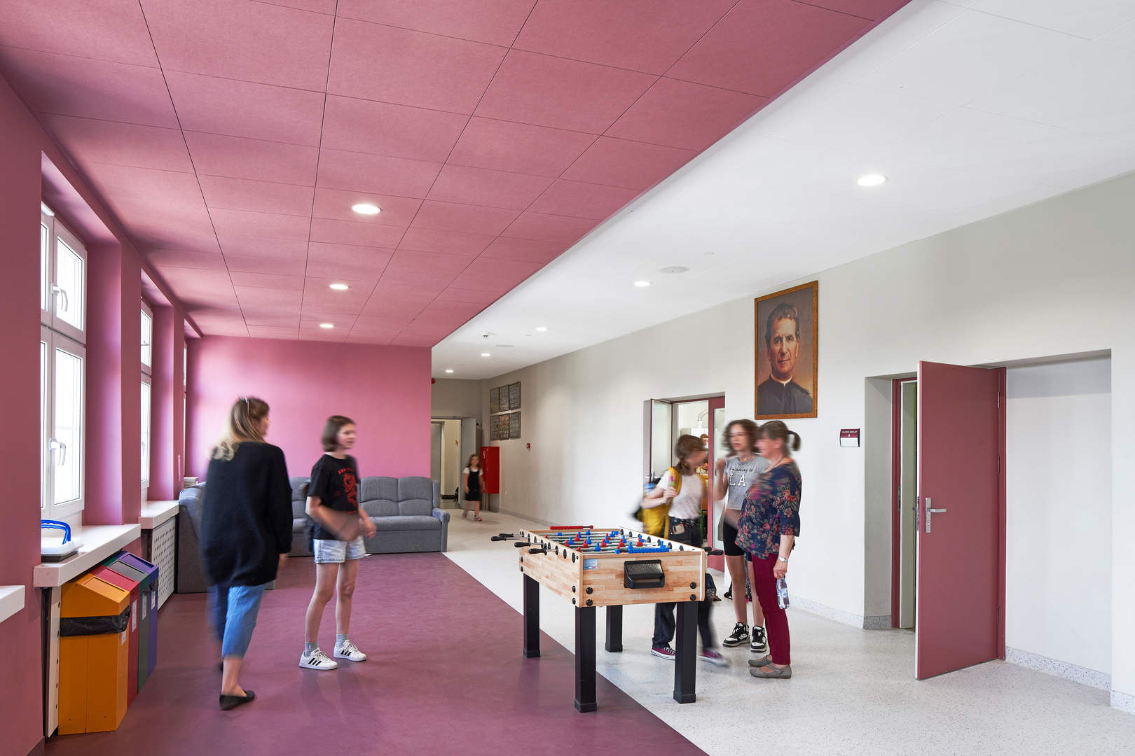 Het Rockfon Color-all gamma biedt keuze uit zichtbare, doorzak- of verdekte kantafwerkingen en is beschikbaar in uiteenlopende afmetingen. Hierdoor is het systeem geschikt voor zowel renovatie- als nieuwbouwprojecten. De panelen ondersteunen visuele zonering: bijvoorbeeld het markeren van gangen, klaslokalen, rustruimtes of leerpleinen, zonder concessies aan esthetiek of functionaliteit.