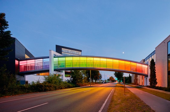 De Brilluxbrug, gelegen in Münster, is een opvallende blikvanger die 20 verschillende kleurschakeringen telt over een afstand van 40 meter. Deze brug fungeert als een essentiële verbinding tussen werk en opleiding aan de ene kant en tijdelijke huisvesting aan de andere kant op het terrein van de verf- en coatingsfabrikant Brillux. Het filigrane ontwerp en de transparantie van de verticale oppervlakken zorgen ervoor dat de brug naadloos opgaat in het stadslandschap. ZINQ Group stond in voor de hoogwaardige poedercoating die een optimale bescherming biedt tegen weersinvloeden, aangebracht door Castrop-Rauxel experts van COATINQ.