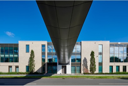 Na wikken en wegen besloot de eigenaar om de brug te renoveren aangezien de onderdoorgang niet geïmplementeerd kon worden vanwege de hoofdleidingen die in dit gebied lopen. Twee gebogen, onafhankelijke stalen liggers vormen nu de volledig beglaasde brug en fungeren als vloer en plafond. De overgang bereikt de eerste verdieping aan beide zijden, de vrije doorgangshoogte ten opzichte van de hoofdweg is 5,20 meter. Alleen van dichtbij is de grondstofbesparende kokerliggerconstructie te zien, waarbij de plaatstalen bekleding de getailleerde vorm van de brugconstructies binnenin aanneemt.