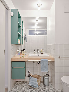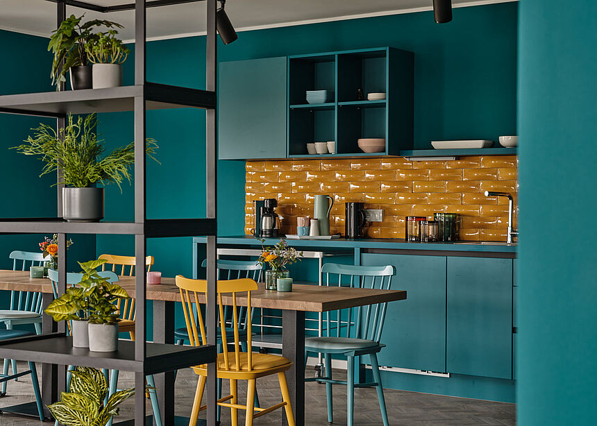 Van de inbouwkasten, die met hun schuifdeuren ware ruimtewonderen zijn, tot de badkamer en de kitchenette, de Hansaallee heeft een goed doordachte inrichting die er goed uitziet, perfect functioneert en voldoet aan de individuele eisen van de bewoners. De openbare ruimtes in het gebouw zijn bijzonder kleurrijk, zodat het pand zich visueel onderscheidt van de saaie monotonie van de meeste bejaardentehuizen.