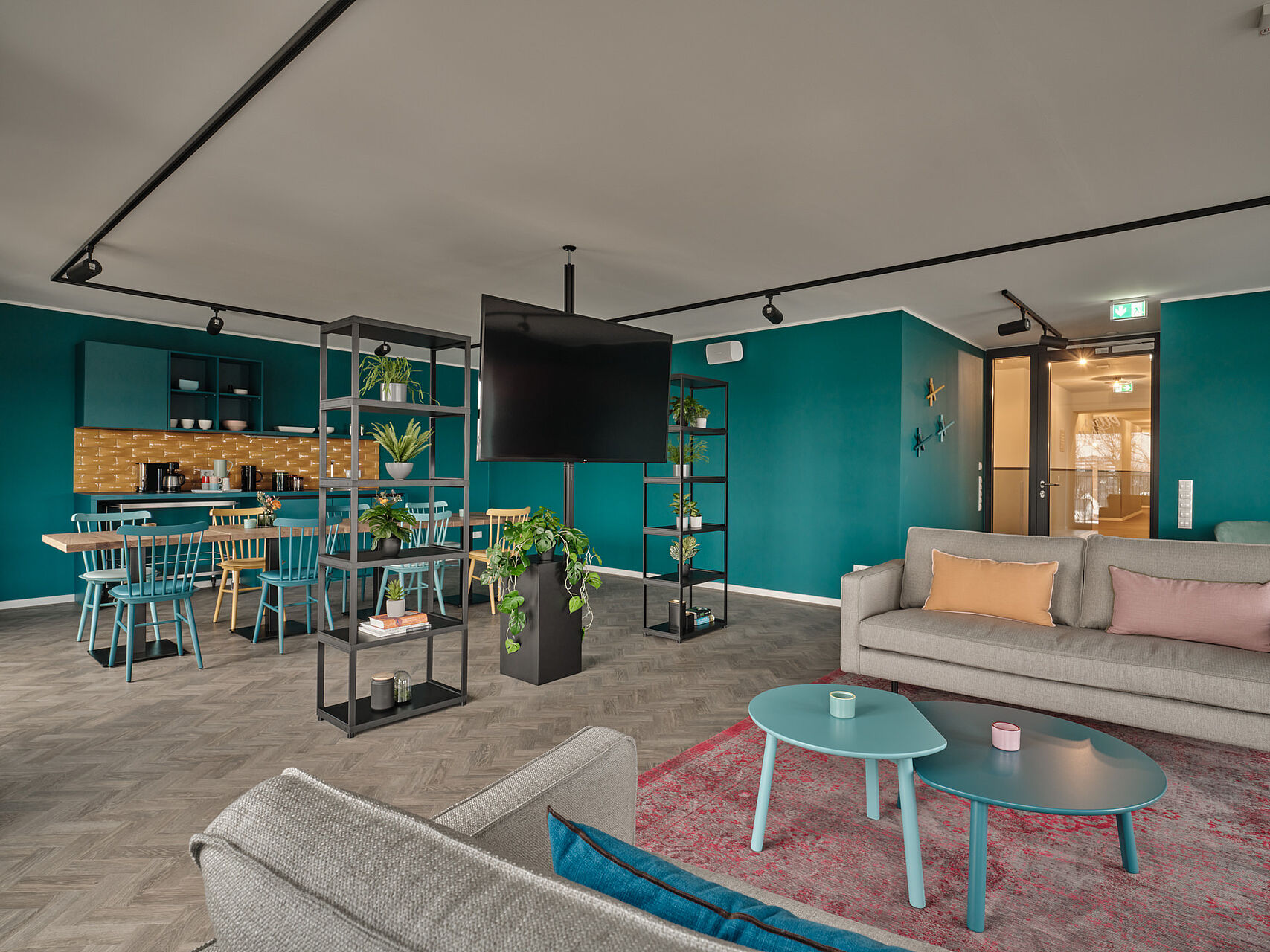 Voor Pro Urban betekent dit niet alleen aantrekkelijk ontworpen appartementen, maar ook een harmonieus ruimtelijk concept: naast de appartementen en het dagverblijf heeft het gebouw aan de Hansaallee ruime, semi-openbare ruimtes die beschikbaar zijn voor de bewoners voor hun activiteiten. Hiertoe behoren gemeenschappelijke ruimten op alle verdiepingen, een groot dakterras, een binnenplaats en een gemeenschappelijke keuken, evenals een receptie die 24 uur per dag bemand is. Het restaurant in het gebouw, dat open is voor het publiek, bevordert de dialoog met de stedelijke omgeving door een lunch aan te bieden.