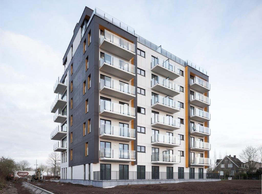 Aan de oevers van de Ijzer in Diksmuide verrees de voorbije maanden het eerste blok van het langverwachte Ijzerparel-project. Een naam die de lading volledig dekt, want het recent opgeleverde gebouw manifesteert zich als een fraai architecturaal hoogstandje. Dit is onder meer te danken aan de markante gevels, die bekleed zijn met EQUITONE [tectiva]- en [pictura]-panelen. De combinatie van roomwitte, bruine en oranje gevelelementen resulteert in een stijlvolle uitstraling die de prestigieuze locatie alle eer aandoet.