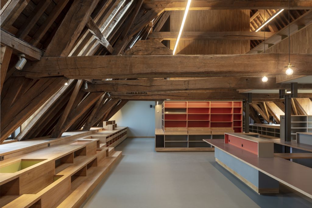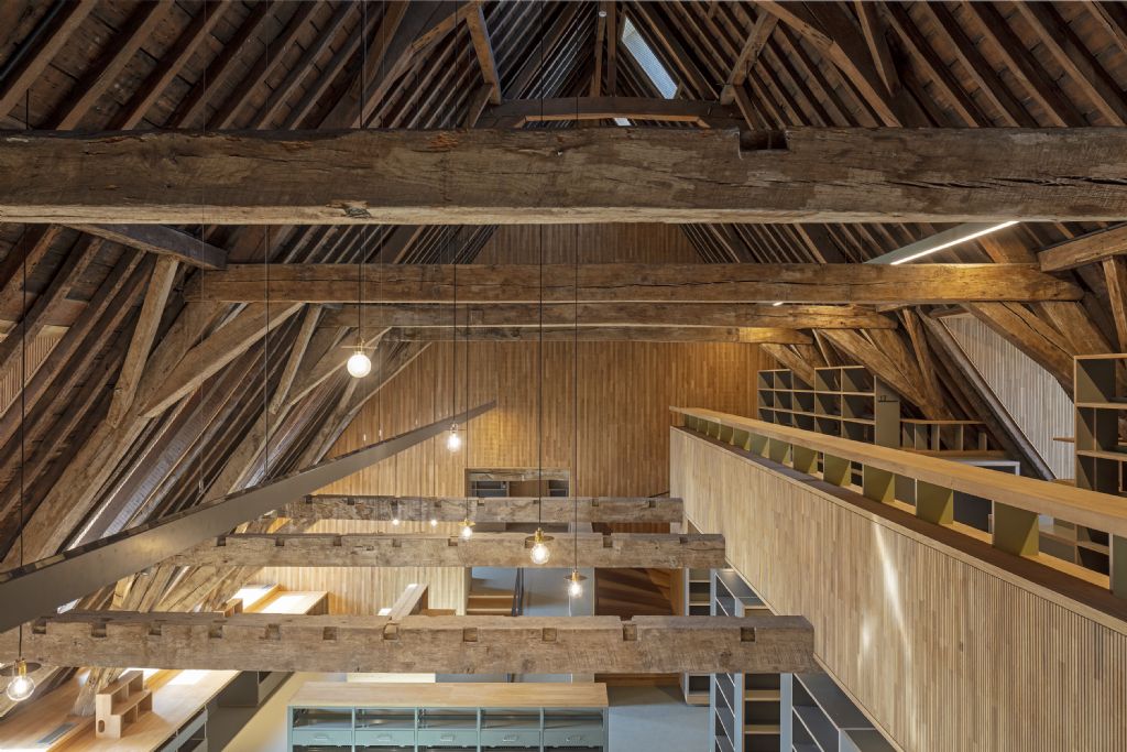 Het meest indrukwekkende gedeelte van het gebouw is zonder twijfel de reusachtige zolder, waar de imposante dakconstructie met houten balken behouden blijft. Het is daar dat het grootste deel van de bibliotheekcollectie een plaats kreeg. Nieuw toegevoegde dakkapellen zorgen voor veel lichtinval en een mooi uitzicht. “Om het karakter van de ruimte met de fraaie houtconstructie en alle houten afwerkingen zo veel als mogelijk in het zicht te kunnen laten, was het nodig het dak van bovenaf te versterken door een van binnen niet zichtbare staalconstructie. Die staalconstructie draagt het vernieuwde leien dak en de nieuwe dakkappelen en zorgt er van bovenaf voor dat de bestaande structuur wordt ontlast”, aldus Stuhlmacher.