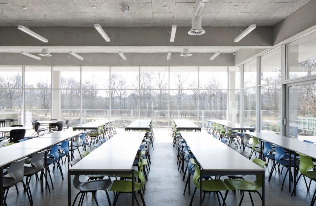 Het project diende zich voor de architecten aan als een ruimtelijk vraagstuk. Enerzijds moesten ze zich baseren op genormeerde vierkante meters (goedgekeurd door AGIOn), anderzijds waren het gevraagde programma en de bijhorende netto vloeroppervlakte eigenlijk groter dan wat normatief voorzien was. “Het was aan ons om hieraan tegemoet te komen zonder de grootte van de klaslokalen bij wijze van spreken te halveren”, aldus Baeye. “Een kwestie van compact bouwen, multifunctioneel gebruik en/of combinatie van verschillende ruimtes, optimalisatie van circulatieruimtes en herorganisatie binnen de bestaande gebouwen – evenwel zonder een benepen geheel met onvoldoende afstand tussen de verschillende programmaonderdelen te creëren. Alle functies zijn dan ook gegroepeerd rond een patio die de nodige relaties legt, maar tegelijk ook afstand creëert. Door de veelheid aan beglaasde geveloppervlakken is de relatie met buiten overal voelbaar. Net als in onze andere schoolprojecten hebben we ons gehoed voor een al te letterlijke vertaling van het eisenprogramma en hebben we een extra meerwaarde kunnen creëren door ontwerpelementen toe te voegen die initieel niet gevraagd waren. Een mooi voorbeeld is het dak dat op het eerste niveau aansluit bij de woordkunst-dramalokalen, zodat deze zone bij mooi weer kan fungeren als openluchtklas.”