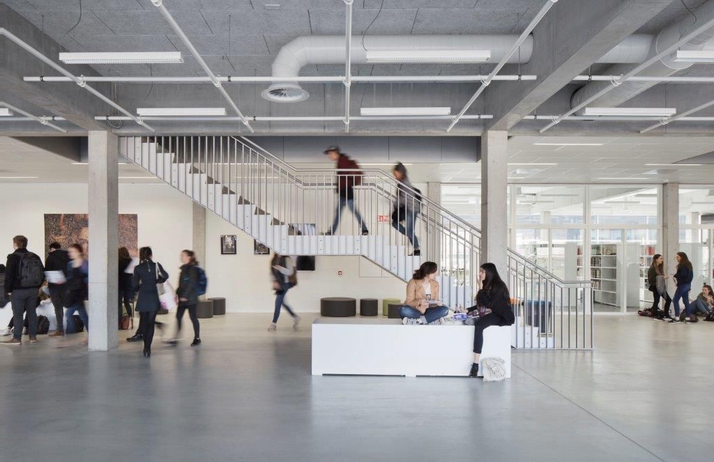 Creatieve vrijheid en ruimte voor expressie zijn van cruciaal belang in een artistieke omgeving zoals een Provinciale Kunsthumaniora. In de eerste plaats moest de nieuwbouw dan ook antwoord bieden op het nijpend plaatsgebrek waarmee de school al verscheidene jaren te kampen had. “Vandaar dat er sprake was van een dens programma en een omvangrijk eisenpakket: veertien leslokalen voor algemene vakken, vier woordkunst-dramaklassen die volledig uitgerust zijn met theatertechnieken (spots, regiekamer, uitschuifbare tribune …), drie notenleerklassen en zanglokalen, een opsplitsbare sportzaal met bijhorende kleedkamers, een studieruimte, een bibliotheek, een refter en polyvalente ontmoetingsruimtes”, aldus Maarten Baeye, projectarchitect bij Stéphane Beel Architects. “Dit alles om het complex in zijn geheel studentgerichter te maken. Voordien bestond de school immers uit drie afzonderlijke vleugels met monofunctionele gangen en was er niet echt sprake van een centrale kern waar de leerlingen elkaar konden treffen. Het uitgangspunt van het project was dan ook dat er een nieuw ‘hart’ voor de school moest worden gemaakt. Tegelijk is het plan open en ongedwongen, zodat men er zich vrij kan bewegen en het complex ook na de schooluren gebruikt kan worden voor andere doeleinden.”