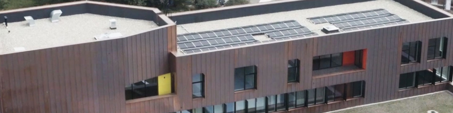 En niet enkel de school is uniek, ook de koperen gevel ervan. CPE mocht de volledige gevelopbouw leveren voor partner Holzbau & Bedachungen Mertes: Ursa isolatie, onderdakfolie, de koperen gevelbanen en de kleuraccenten in Trespa.