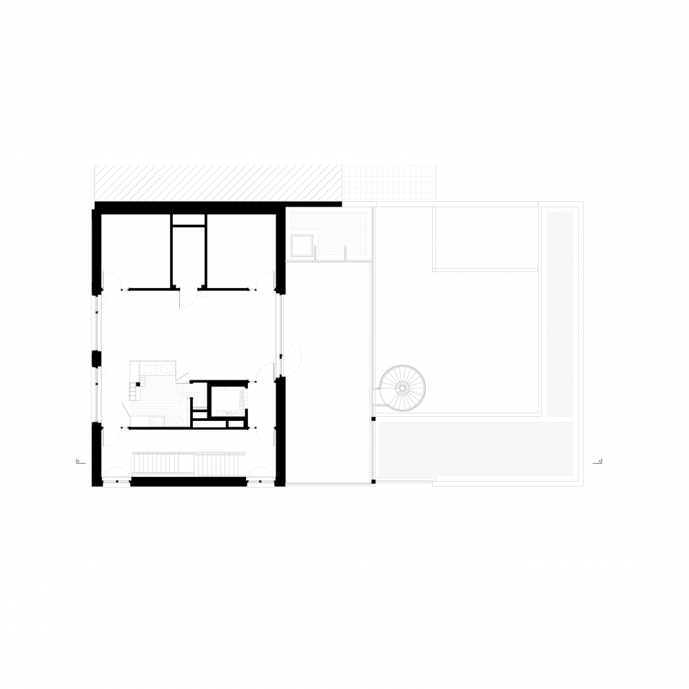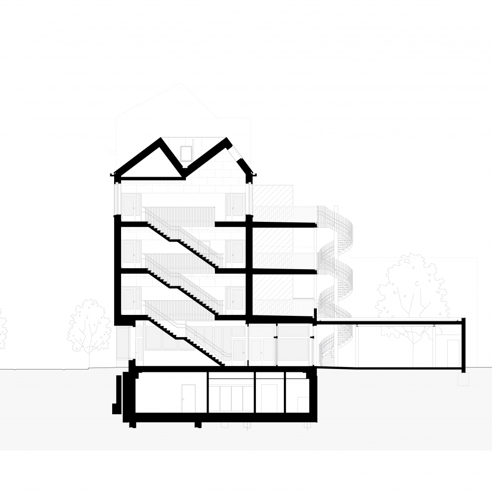 De tuin en meerdere terrassen nodigen uit tot spel en rust, en brengen de kinderen in direct contact met de natuur. De toekomstige doorsteek geeft het geheel een langgerekt ‘gezicht’, met twee toegangen: via het inkomsas of via een poort in het hekwerk. Dit open karakter maakt dat het gebouw niet louter een crèche is, maar een gedeelde plek voor zorg, ondersteuning en ontmoeting.
