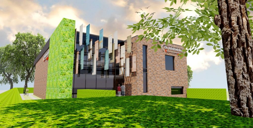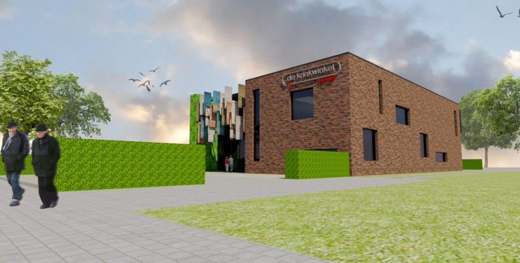 De façade van de nieuwe kringwinkel werd bekleed met afval-gevelstenen van fabrikant Nelissen Steenfabrieken, waar steenstrips van gezaagd waren. “Normaliter is dit afval of in het beste geval wordt dit verwerkt tot steenpuin als onderfundering van wegenissen”, aldus Gijsenberg. “Oude buitendeuren werden toegepast als zonnewering in de zuidgevel. Fout gemeten ramen werden geïntegreerd in de gevel, vandaar de diversiteit van de raamopeningen.