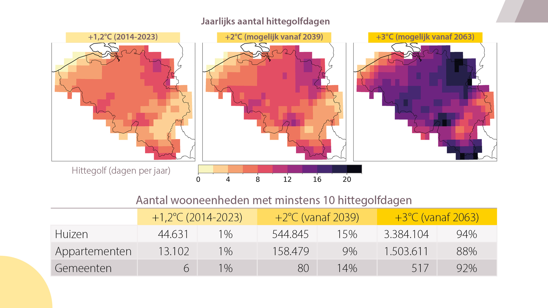 Vandaag worden woningen in ons land zelden meer dan 40 dagen per jaar blootgesteld aan buitentemperaturen boven 25 °C. In een wereld die 2 °C warmer is, zou dat al gelden voor ongeveer één op de vijf woningen. Bij een opwarming van 3 °C stijgt dit tot negen op de tien woningen. Met andere woorden: bijna alle Belgische gezinnen kunnen rechtstreeks geconfronteerd worden met de ernstige gevolgen van klimaatverandering.
