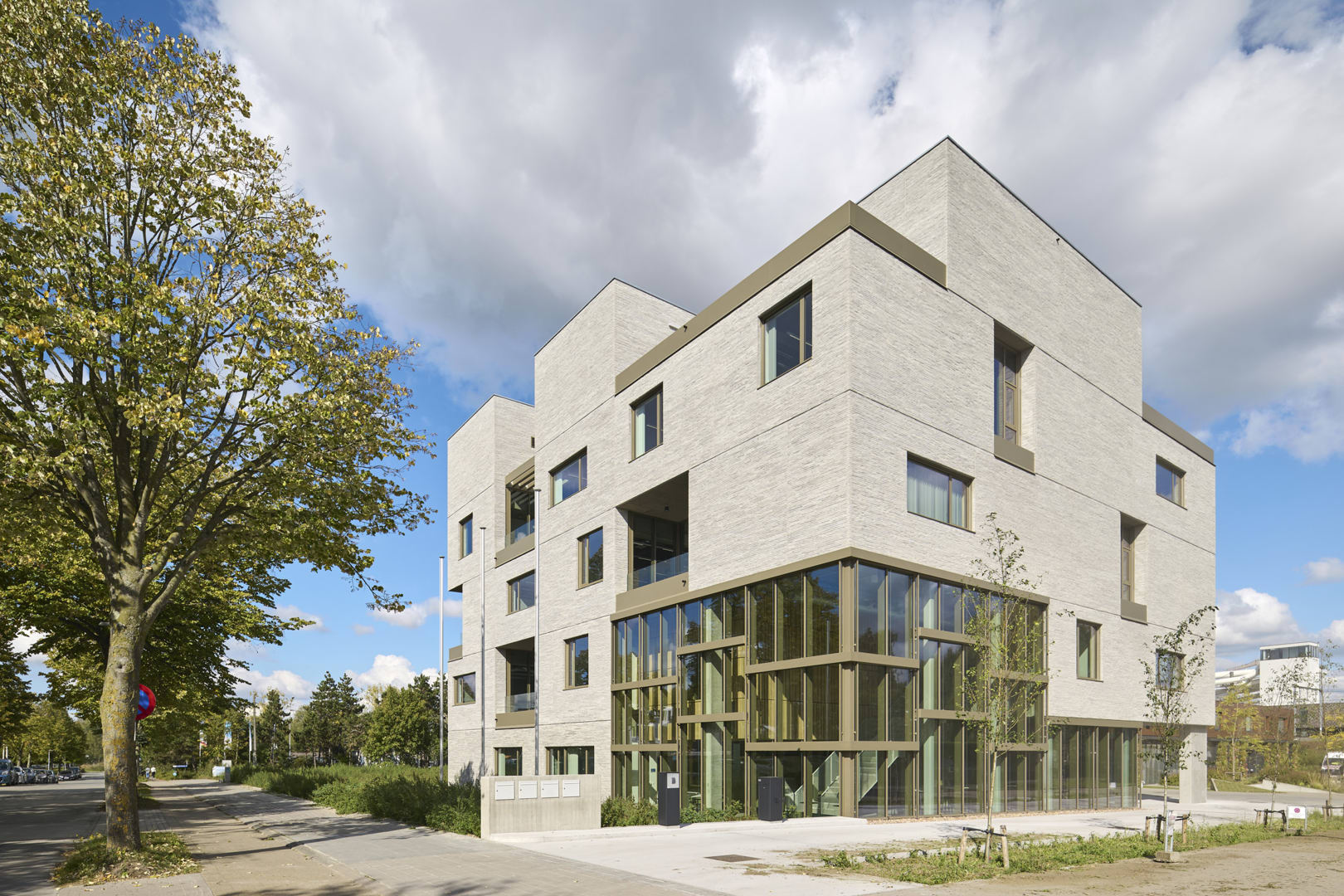 Het ontwerp verwijst naar een Jenga-toren: een dynamische stapeling van blokken die in en uit het grid schuiven. Deze verschuivingen creëren diepe uitsparingen, terrassen en doorkijken die licht en lucht binnenbrengen. De dubbelhoge foyer met Aliplast-vliesgevel versterkt dit gevoel van openheid en transparantie.