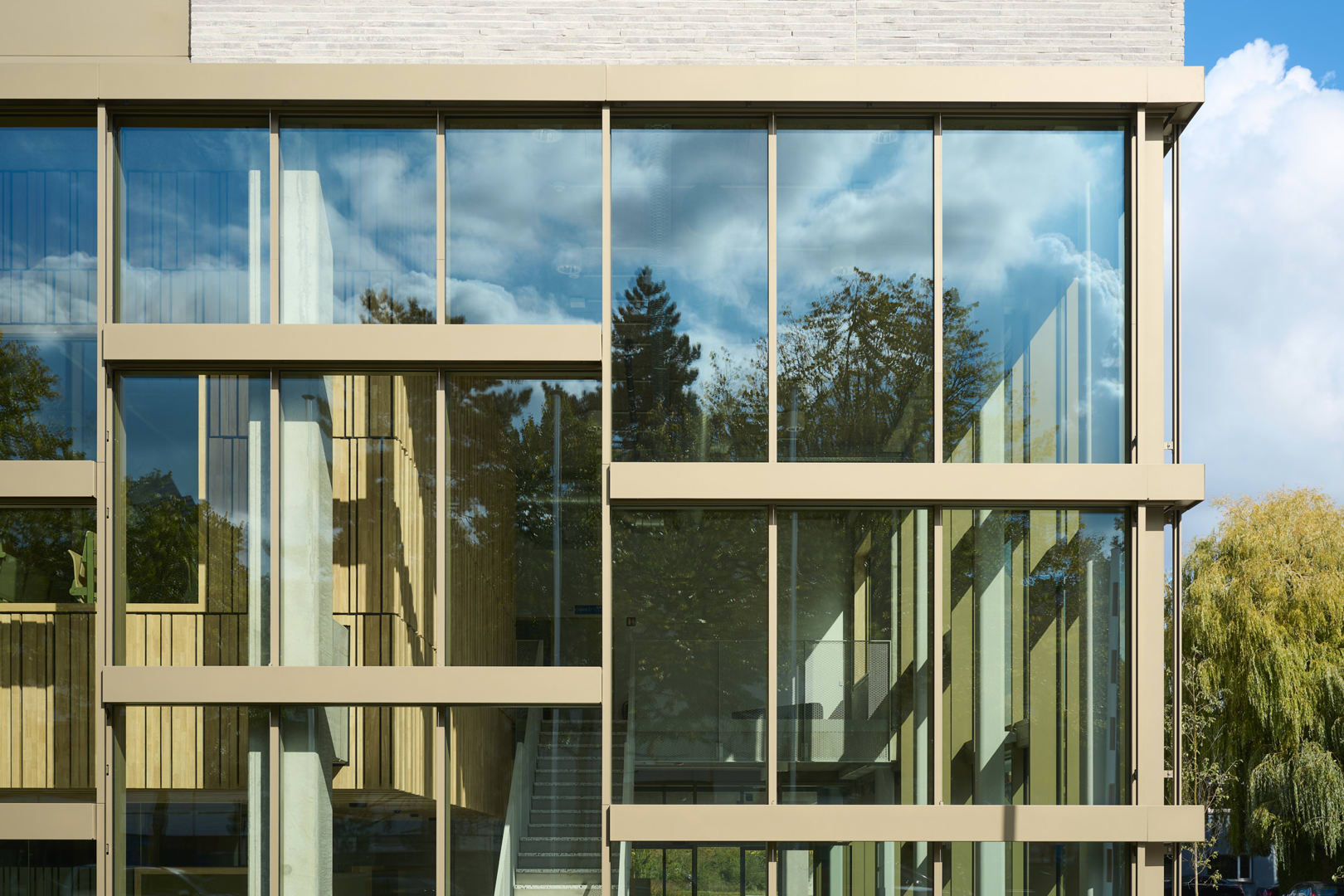 Aanvankelijk werd overwogen om geanodiseerd aluminium te gebruiken, maar dat idee werd verlaten. De reden? De kans op kleurafwijkingen tussen verschillende productiebatches bleek te groot, wat een risico vormde voor de visuele uniformiteit van het gebouw. Daarom werd gekozen voor lakanodisatie — een afwerking die niet alleen een consistentere kleurweergave garandeert, maar ook budgettair interessanter is.