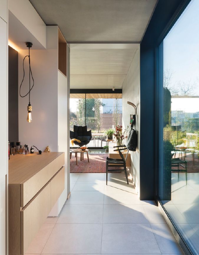 De zithoek en eethoek liggen aan de verdiepingshoge beglaasde achterwand. Genieten van het tuinzicht en privacy ten opzichte van de straat waren leidend voor deze keuze. De centraal gelegen keuken fungeert als buffer om inkijk via de zijgevel vanaf de straat te blokkeren. De lange kastenwand van de keuken is tussen de twee betonwanden geschoven. Aan de rugzijde werd een vestiaire ingericht. Aan de straatzijde tot slot is een open thuiskantoor voorzien. Het grenst aan de enige gesloten ruimtes op deze verdieping: een wasruimte en het toilet. Deze functies zijn bewust beneden georganiseerd met het oog op de flexibiliteit en aanpasbaarheid.