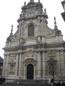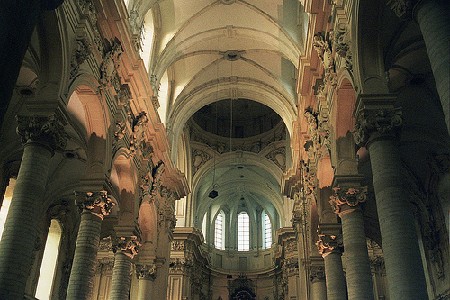De voorgevel van de Sint-Michielskerk (l) en het interieur (r)