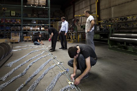 De kunstenaars maken de koepelkettingen aan elkaar vast