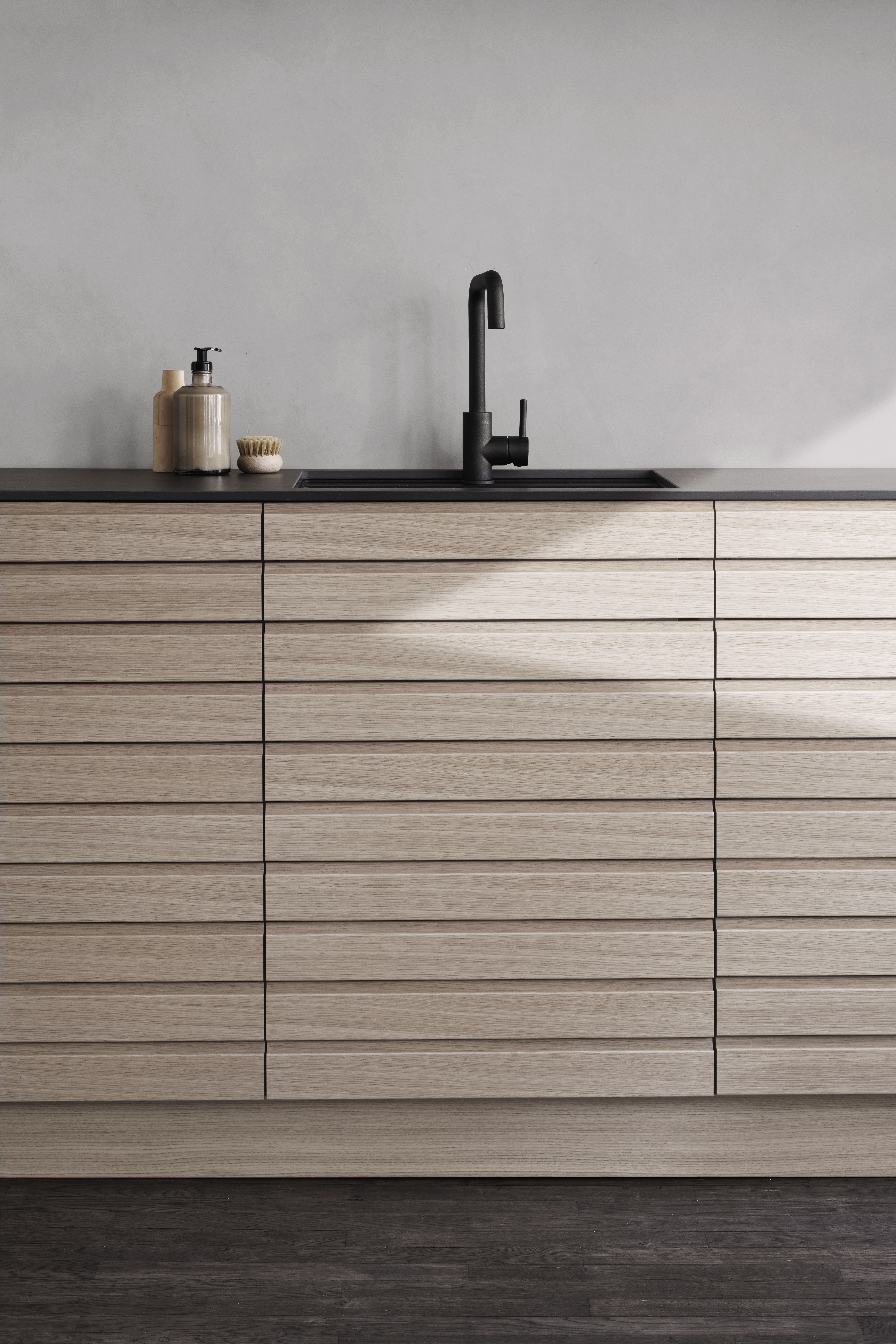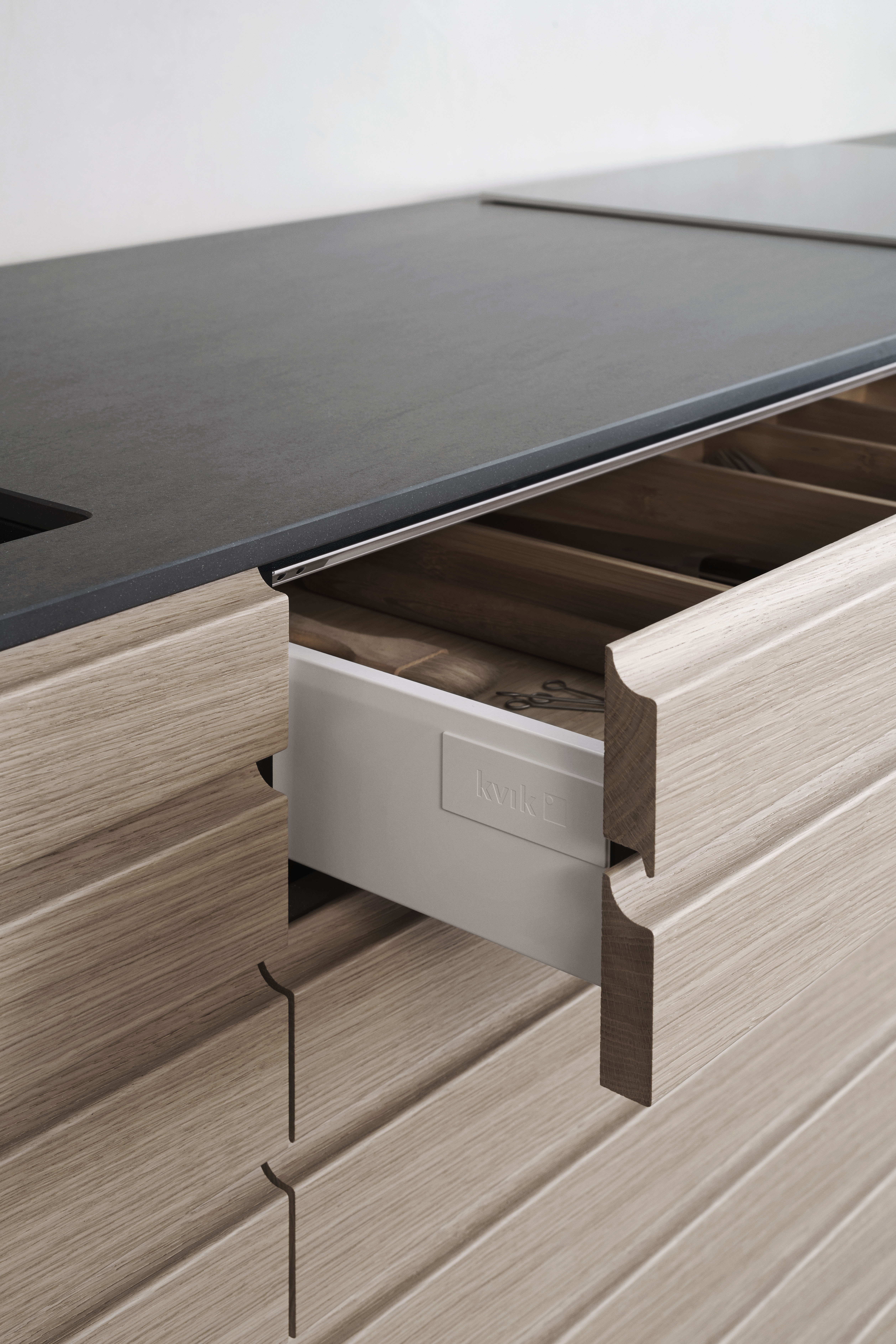 Met ‘Tacto’ en ‘Cima’ wil Kvik natuurlijke materialen en markante texturen in de kijker zetten. De naam ‘Tacto’ verwijst naar het oppervlak in geborsteld eikenhout. Die bewerking doelt erop dat de natuurlijke structuur van het hout beter tot haar recht komt. Voor de handgrepen koos Kvik voor het midden tussen gemonteerde en geïntegreerde exemplaren. Zo lijken ze te versmelten met de kastdeuren.