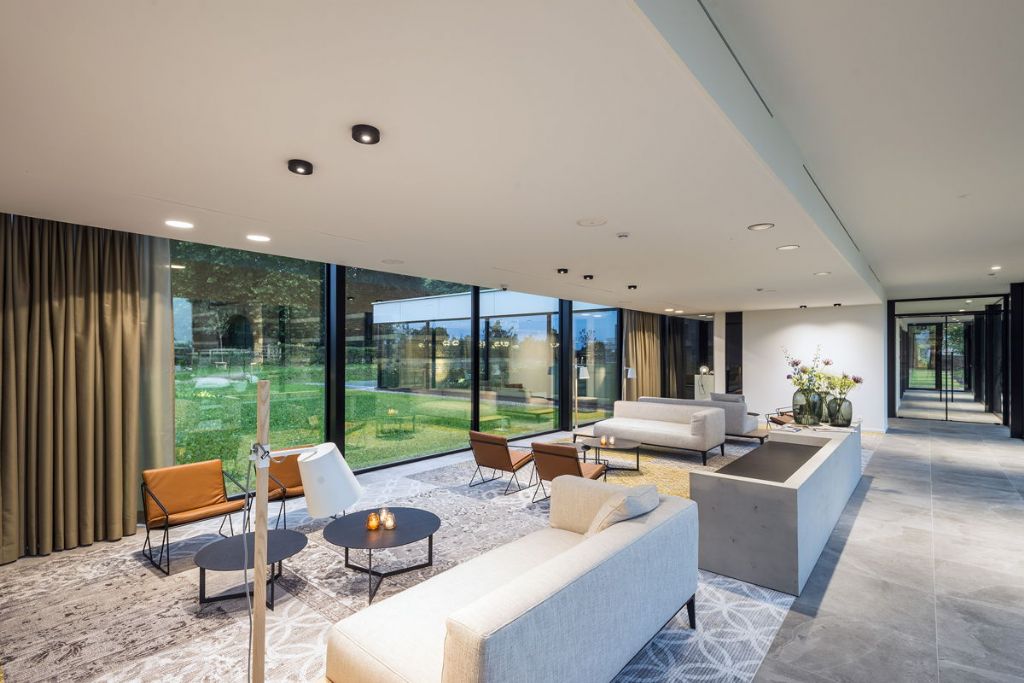 Het zwembad met wellnessgedeelte sluit aan op een ingegraven buitenterras. “De architecten hadden vanaf de aanbesteding een zeer duidelijke visie over de afwerking van het hotel”, vertelt Jeroen Mathijs, werfleider bij Building Group Jansen uit Meeuwen-Gruitrode, het bedrijf dat de afwerking voor zijn rekening nam.