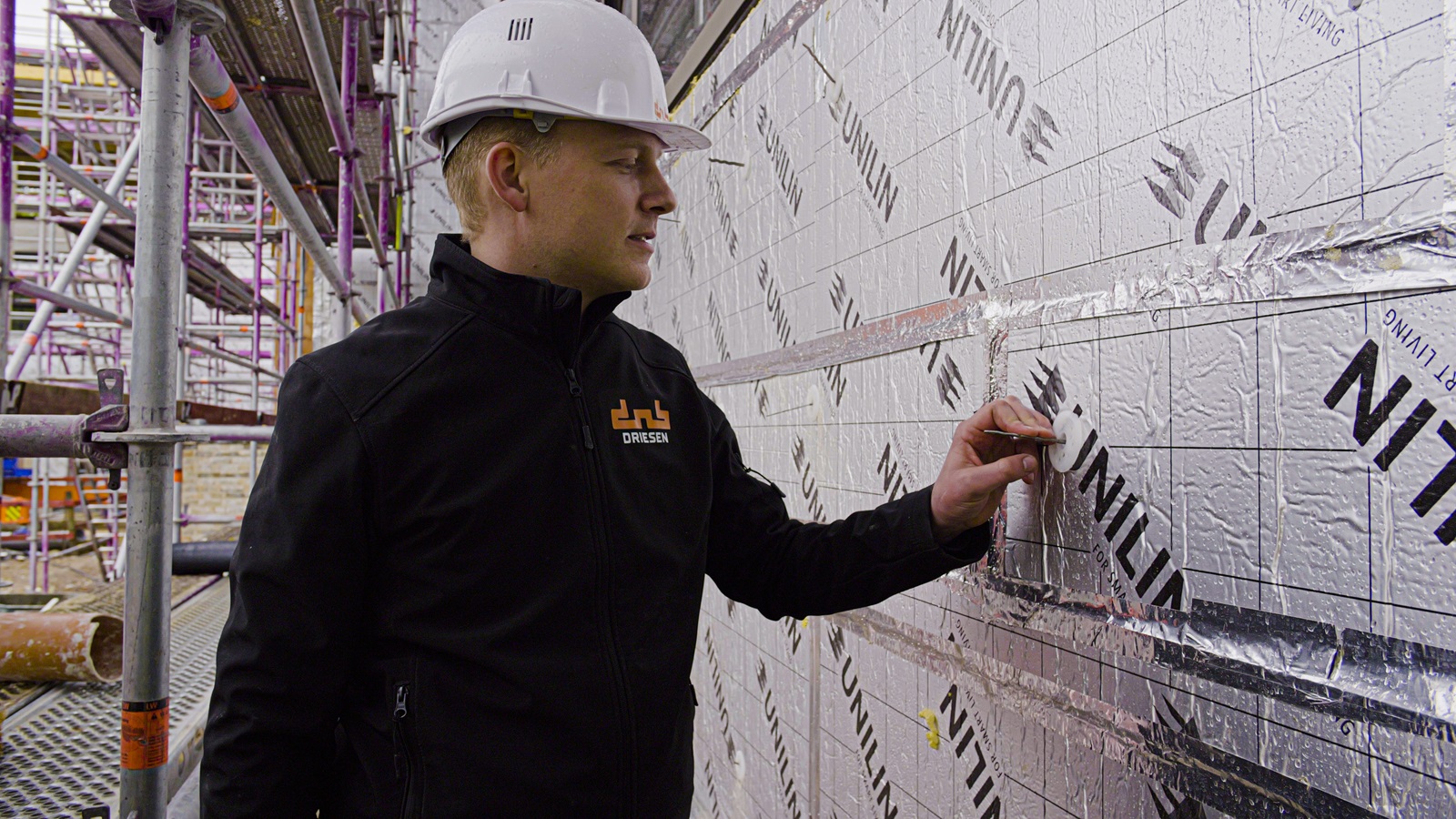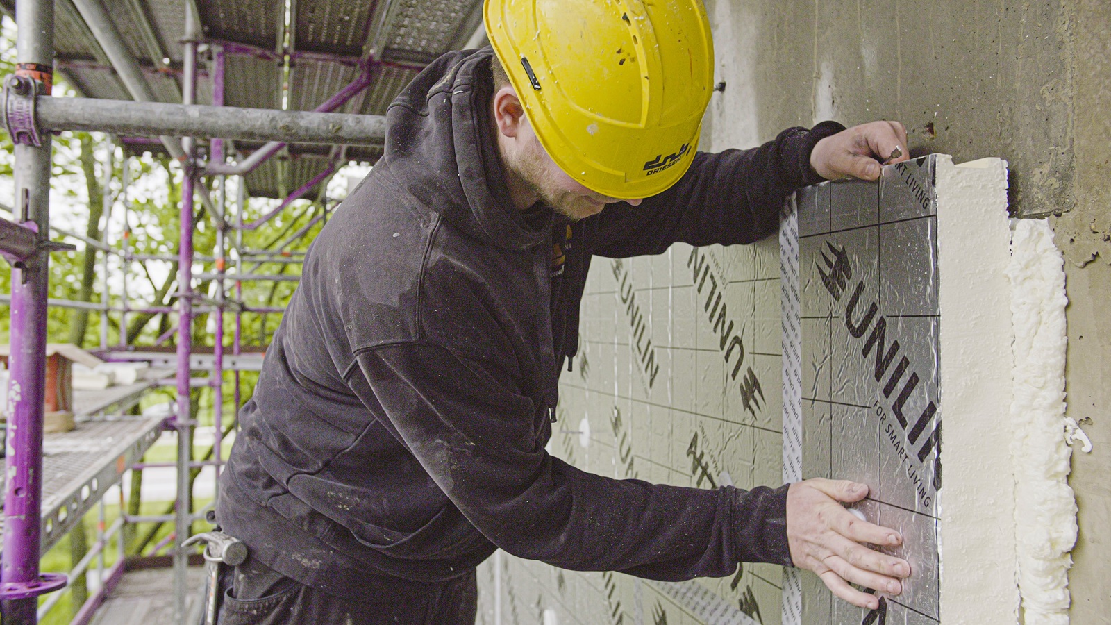 Werfleider Koen Hoeben van Driesen NV werkte graag met Utherm Wall LE: “De platen geschrankt plaatsen neemt iets meer tijd in beslag, maar het resultaat is zeer geslaagd.” Dankzij het tand- en groefsysteem van deze isolatieplaten, de plaatsing in twee lagen van 8 cm en de aftaping van de platen krijgt het campusgebouw een kwalitatief en luchtdicht isolatieschild.