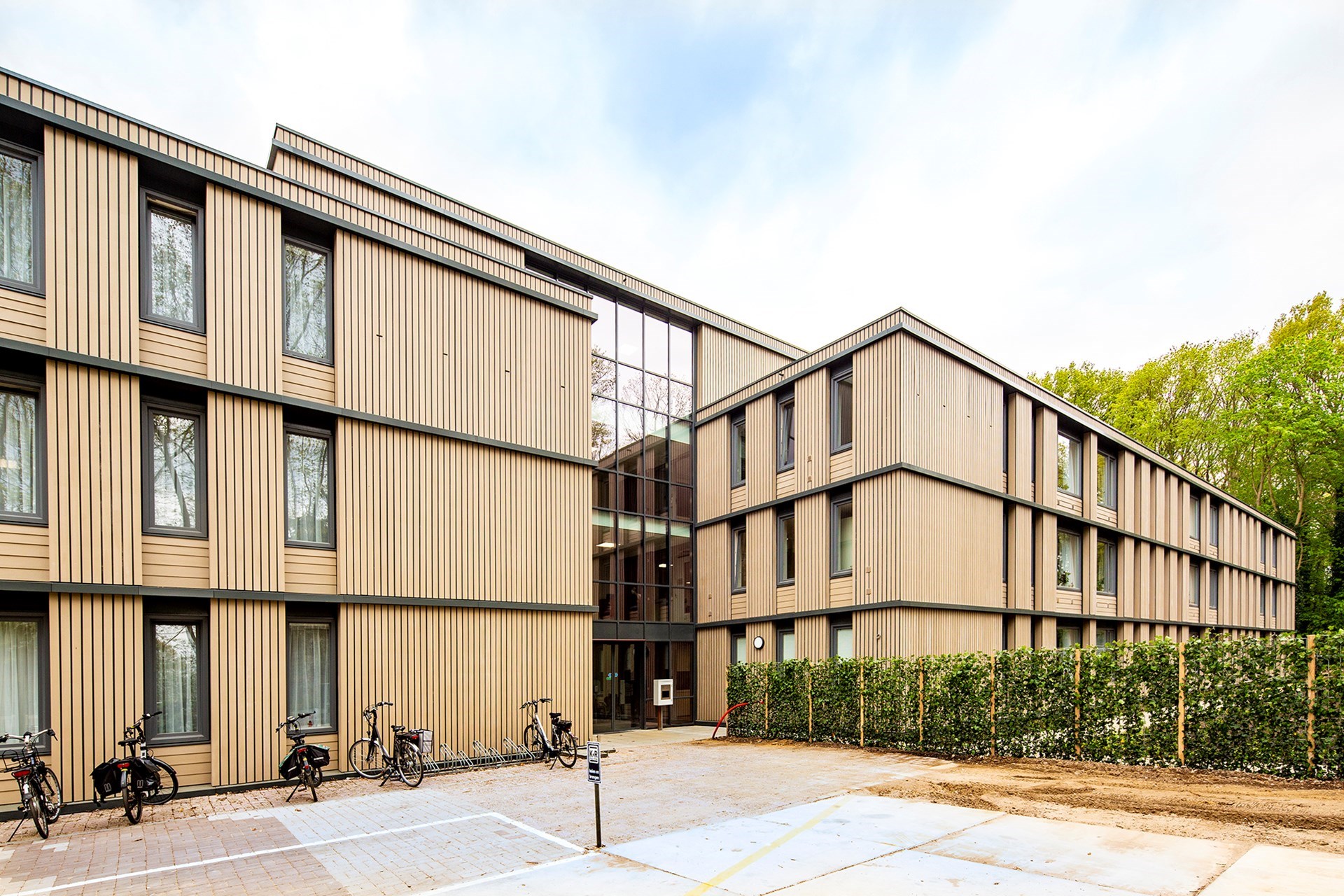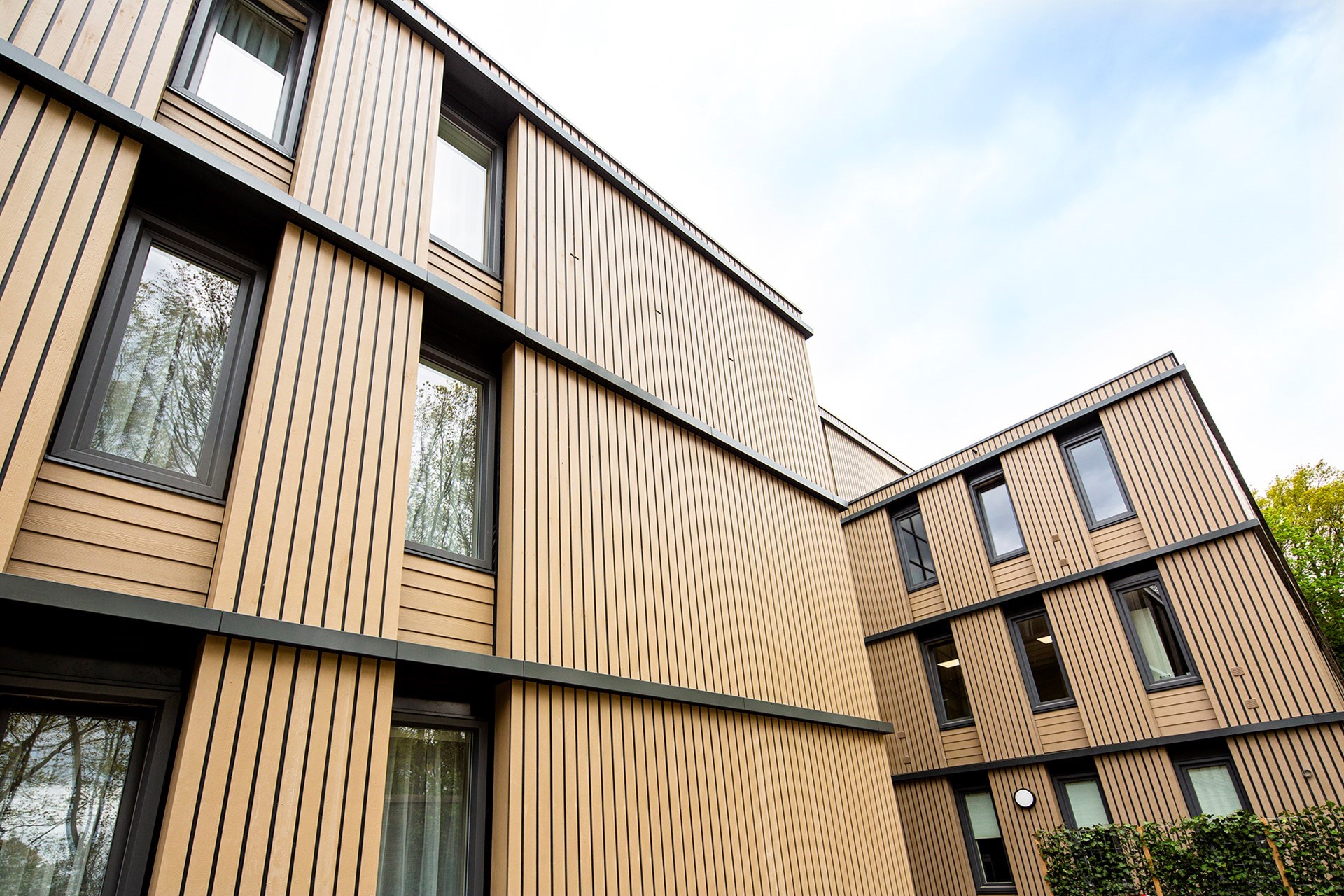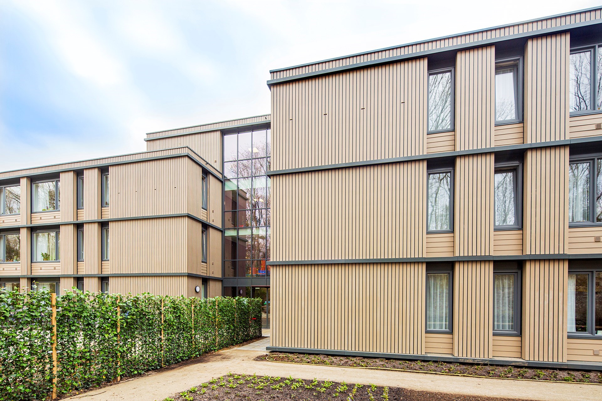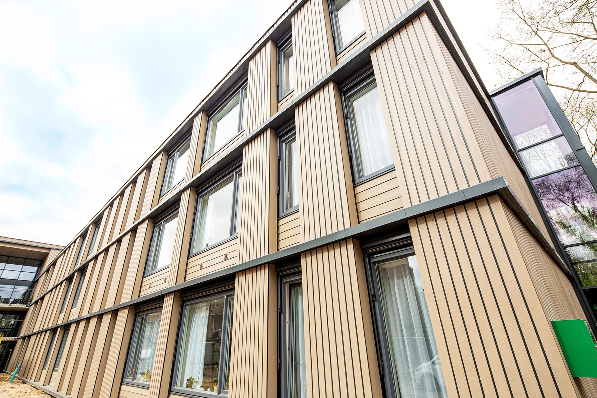 Het zorgcentrum is ontstaan uit de sloop van een verouderd gebouw, waarna een nieuwe accommodatie met drie vleugels werd gerealiseerd. De nieuwe accommodatie omvat in totaal 90 wooneenheden. Wat direct in het oog springt, is de volledige toepassing van Hardie® Plank op de gevel. Dit was geen toevallige keuze, maar eerder het resultaat van een weloverwogen beslissing met verschillende overwegingen.