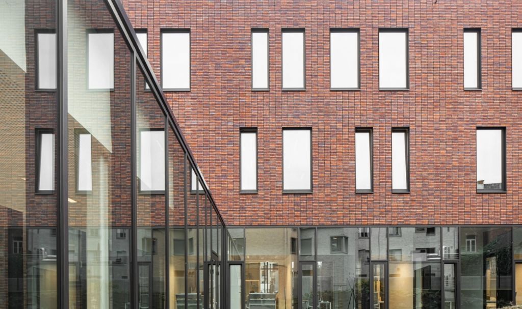 Door het gelijkvloers terug te trekken ontstaat er een overgangszone tussen buiten en binnen. Dezelfde ontwerpstrategie werd eveneens toegepast op de residentiële ontwikkeling. Hierdoor ontstaat een sterke binding tussen beide gebouwen enerzijds en tussen het publiek domein en het interieur anderzijds.