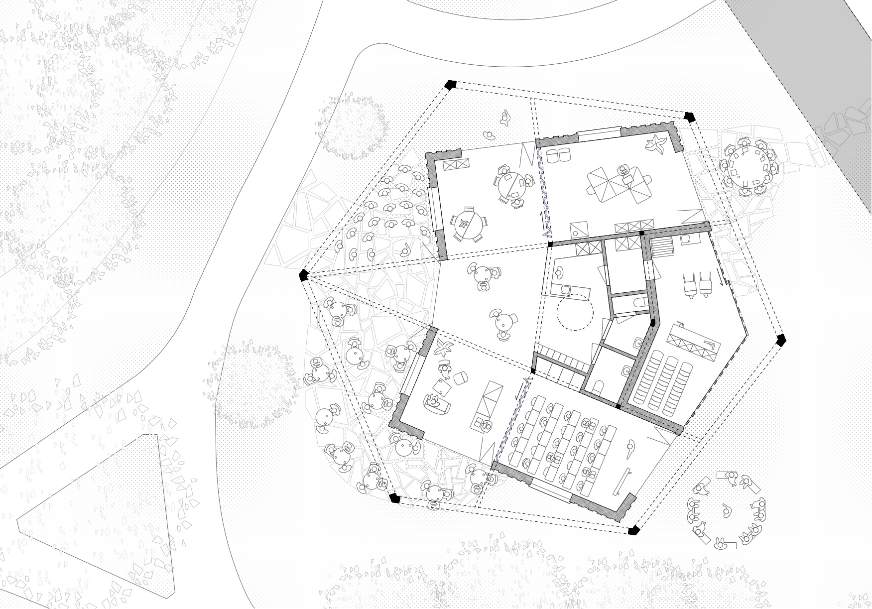 In tegenstelling tot een eerste ontwerp, waar de structuur van het natuurhuis en de invulling als figuur op elkaar afgestemd waren, ontwierp Collectief Noord twee autonomere figuren die toch familie zijn van elkaar. Het vijfhoekig plan voor de invulling bleef behouden, terwijl de luifelstructuur de vorm kreeg van een regelmatige zeshoek.