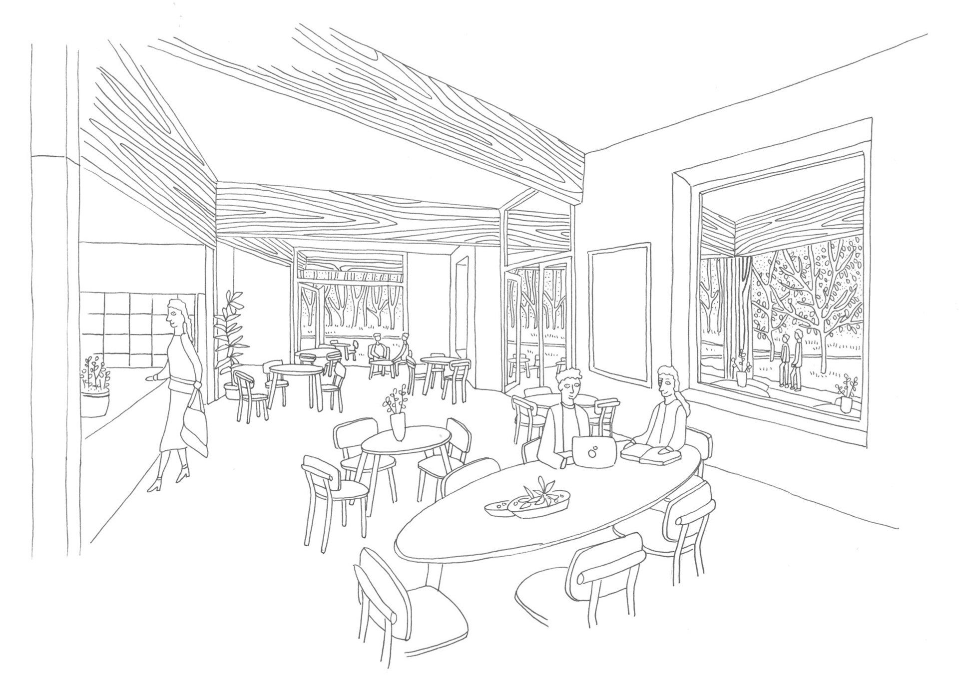 Aangezien de ingenomen oppervlakte van de luifelstructuur groter is geworden, moest Collectief Noord erover waken dat voldoende natuurlijk daglicht het gebouw binnenkomt. Door de structuur lichtjes te verhogen, ontstaat er onder de balken een vrije hoogte van 3.40 m. De grotere schrijnwerkgehelen worden tot tegen de houten dakplaat voorzien, wat niet alleen de daglicht toetreding ten goede komt maar ook de ruimtelijke beleving verhoogt. Het zijn vouwdeuren die volledig opengeschoven kunnen worden en die de binnen-buiten relatie versterken.