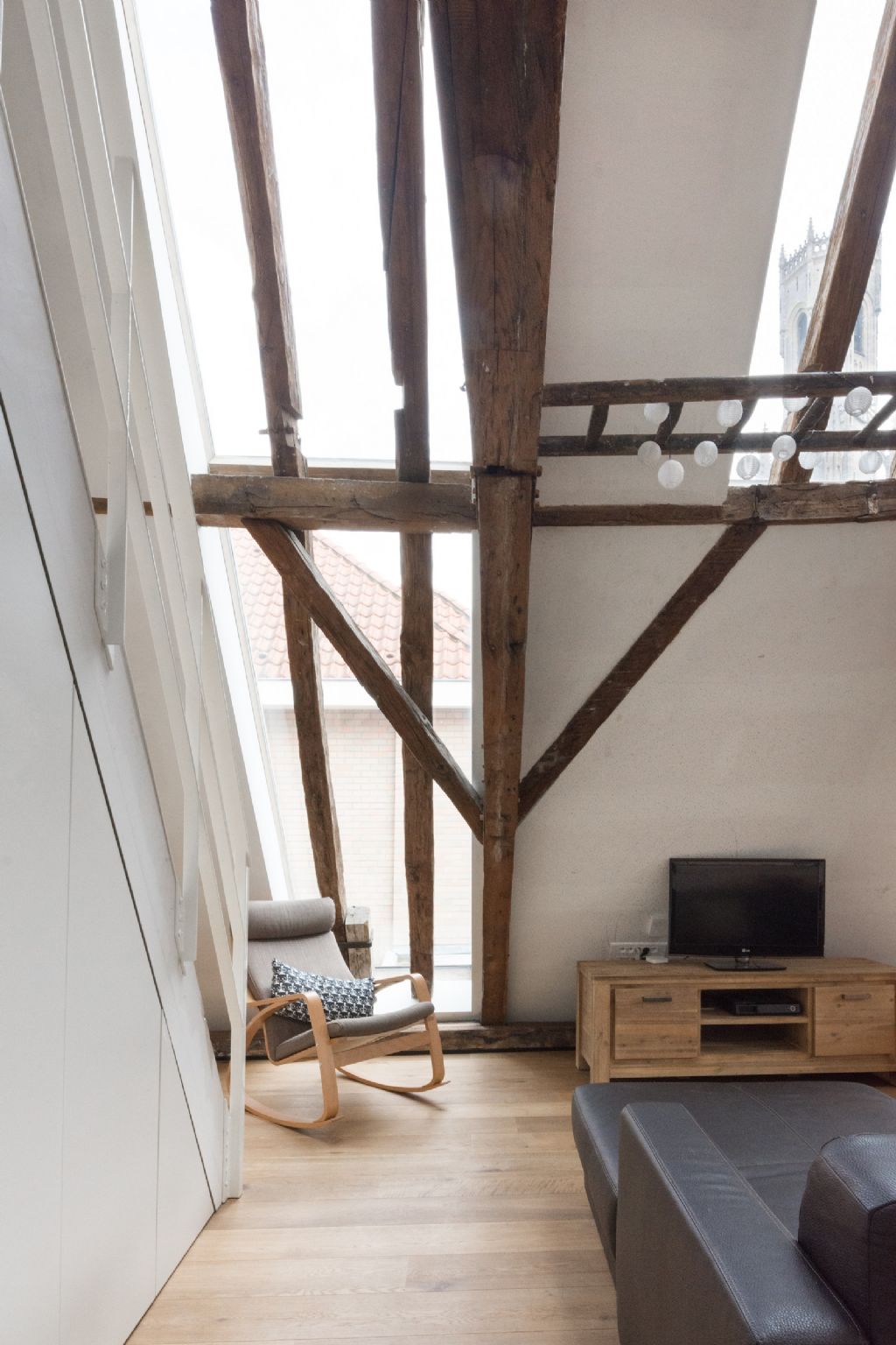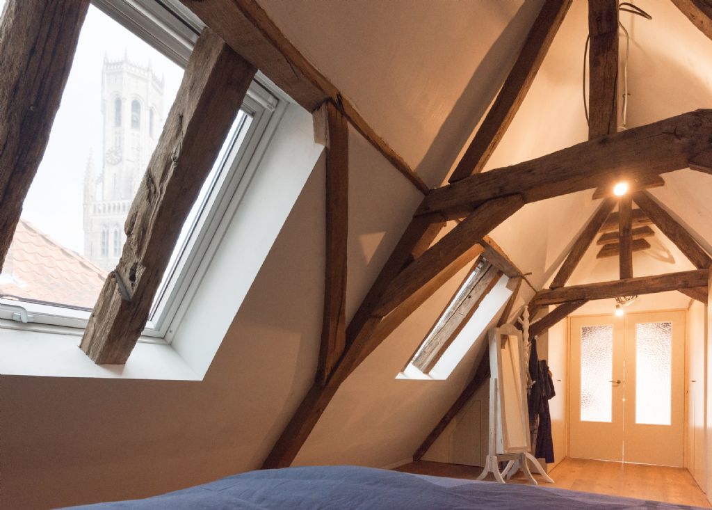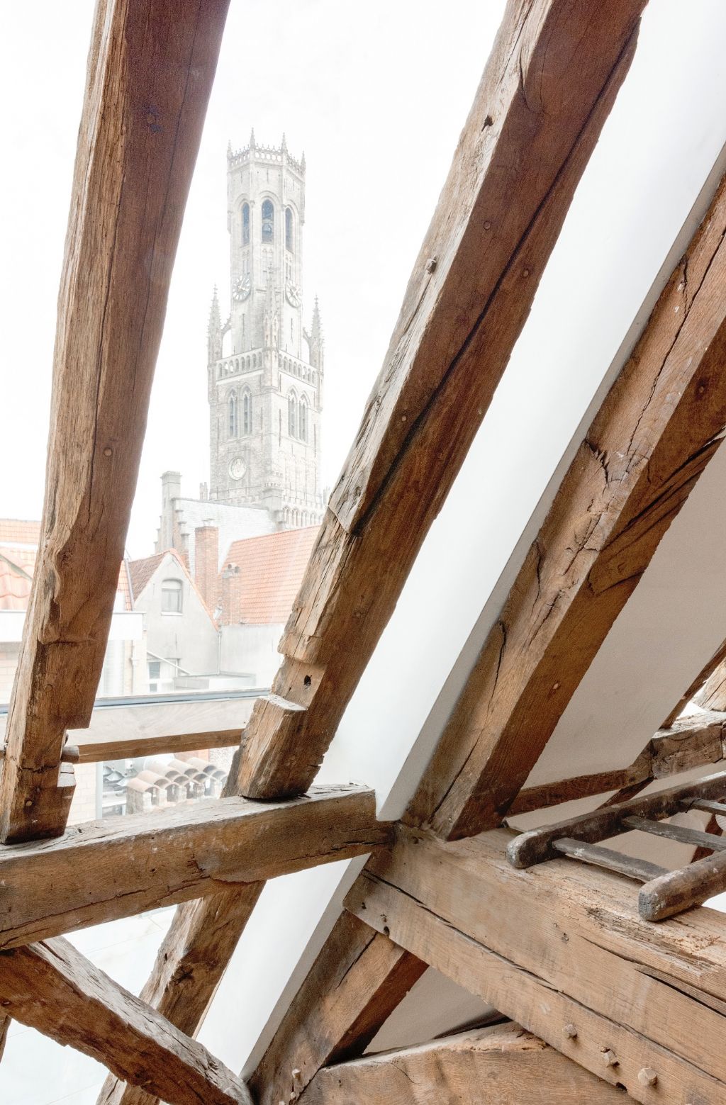 “Bijzonder aan dit project is absoluut de erfgoedwaarde van het beschermde monument. De zestiende-eeuwse sporenkap bleef aan het zicht onttrokken door voorzetwanden en tussenvloeren. Op geen enkele plaats was de mooie dubbelhoge constructie zichtbaar. Van binnenaf deed niets vermoeden dat men zich in het historische hart van Brugge bevond. Uitdaging was dan ook om licht en zicht te creëren zonder hierbij aan de constructie te raken en rekening houdende met andere waardevolle elementen zoals de gemetste bovendakse schouwen”, aldus de ontwerpers.