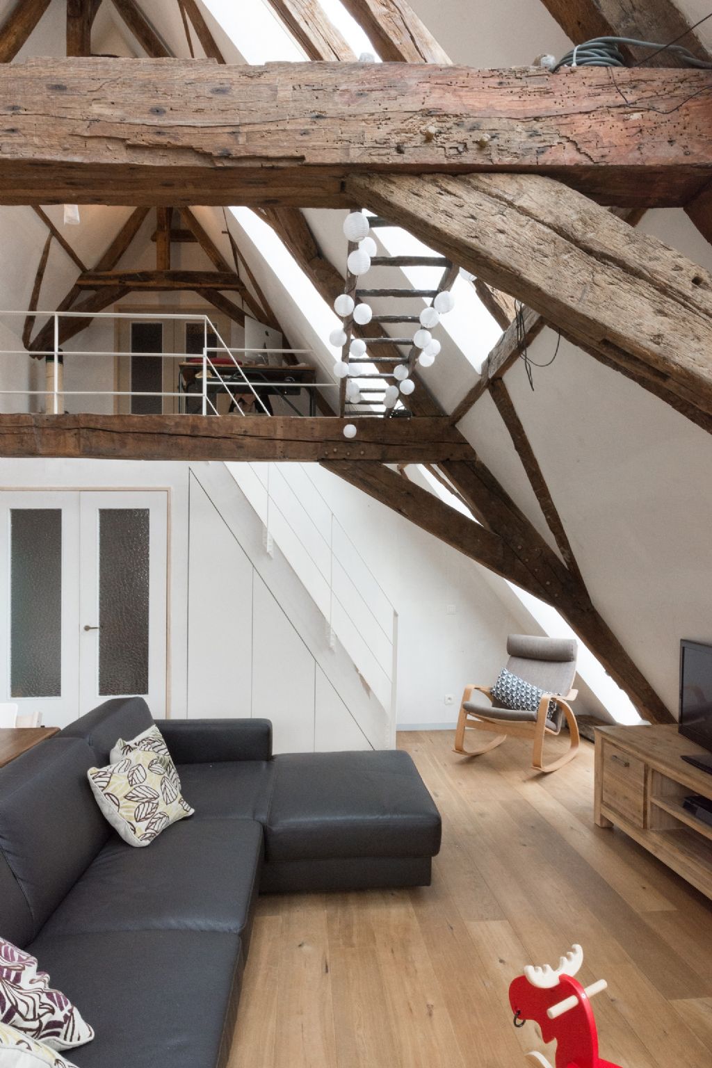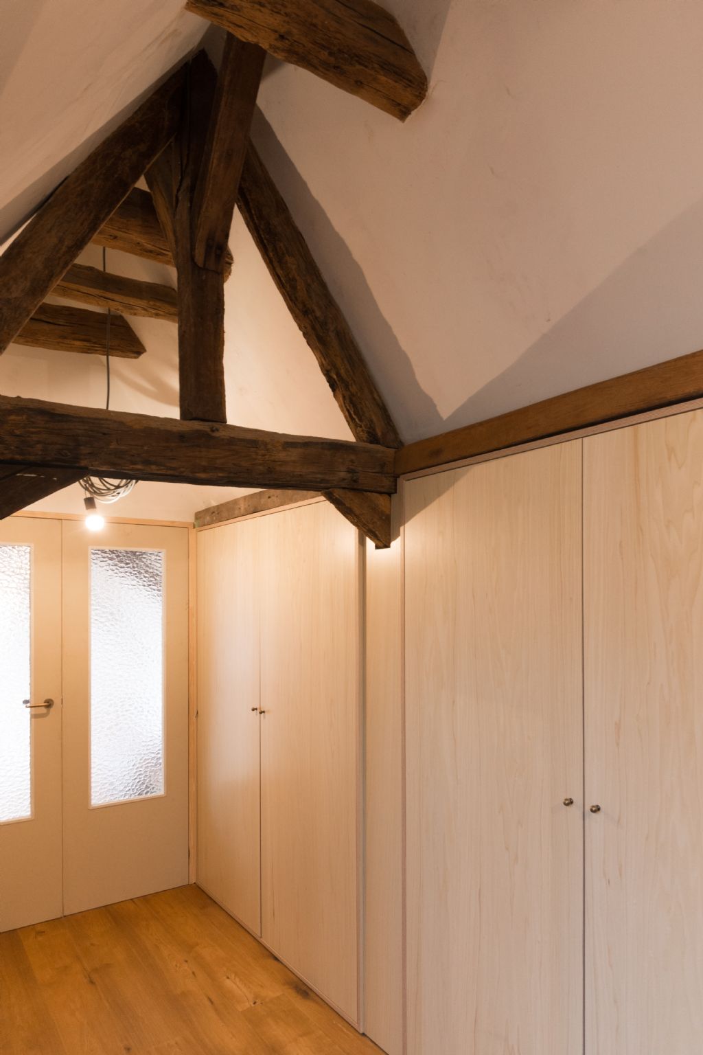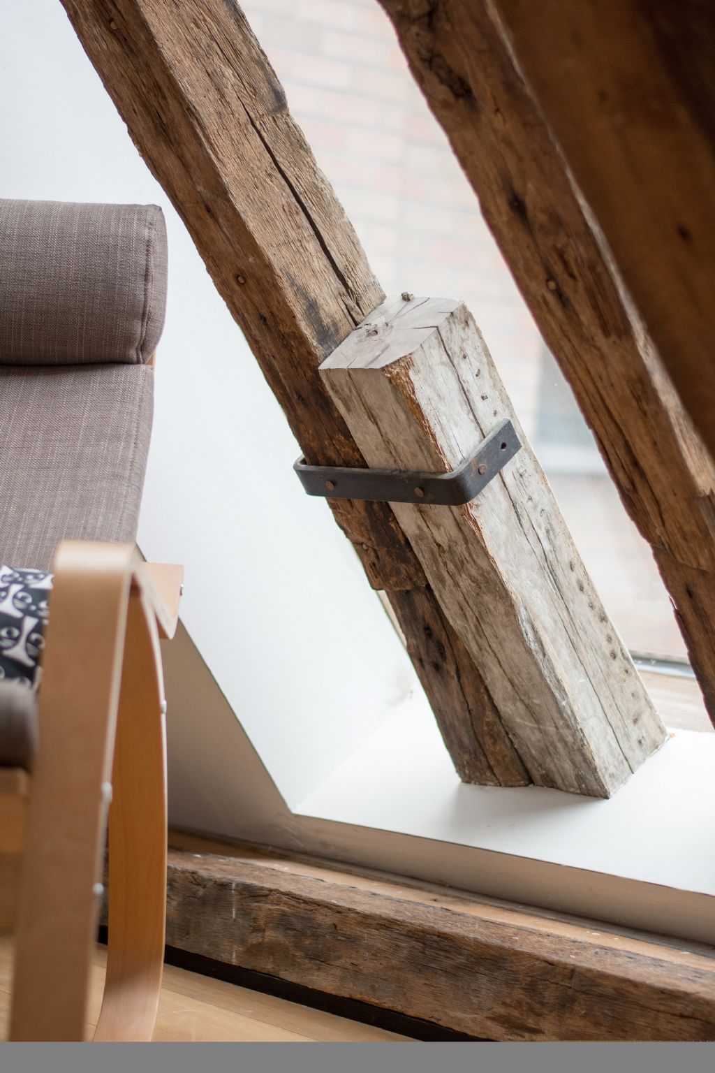 “Bijzonder aan dit project is absoluut de erfgoedwaarde van het beschermde monument. De zestiende-eeuwse sporenkap bleef aan het zicht onttrokken door voorzetwanden en tussenvloeren. Op geen enkele plaats was de mooie dubbelhoge constructie zichtbaar. Van binnenaf deed niets vermoeden dat men zich in het historische hart van Brugge bevond. Uitdaging was dan ook om licht en zicht te creëren zonder hierbij aan de constructie te raken en rekening houdende met andere waardevolle elementen zoals de gemetste bovendakse schouwen”, aldus de ontwerpers.