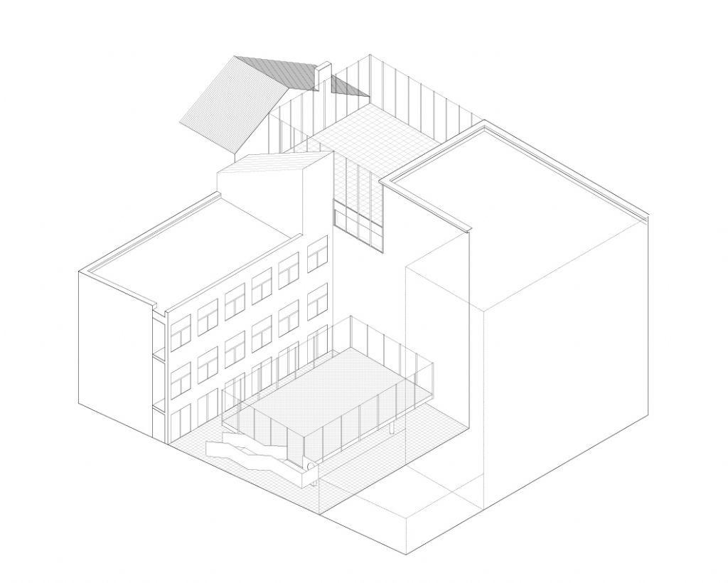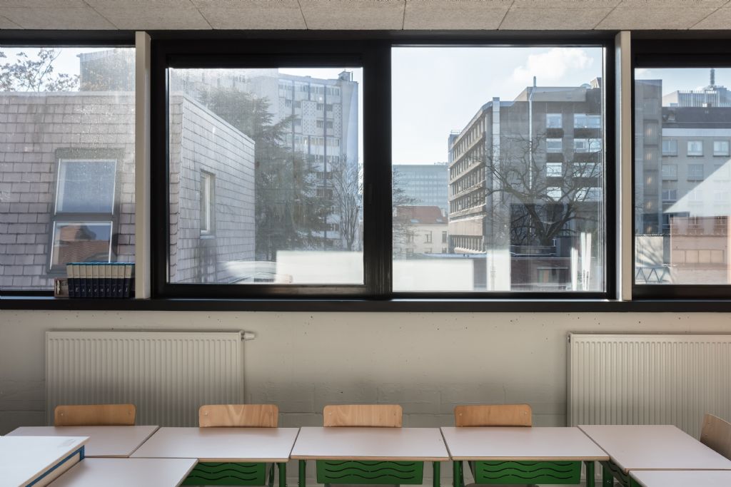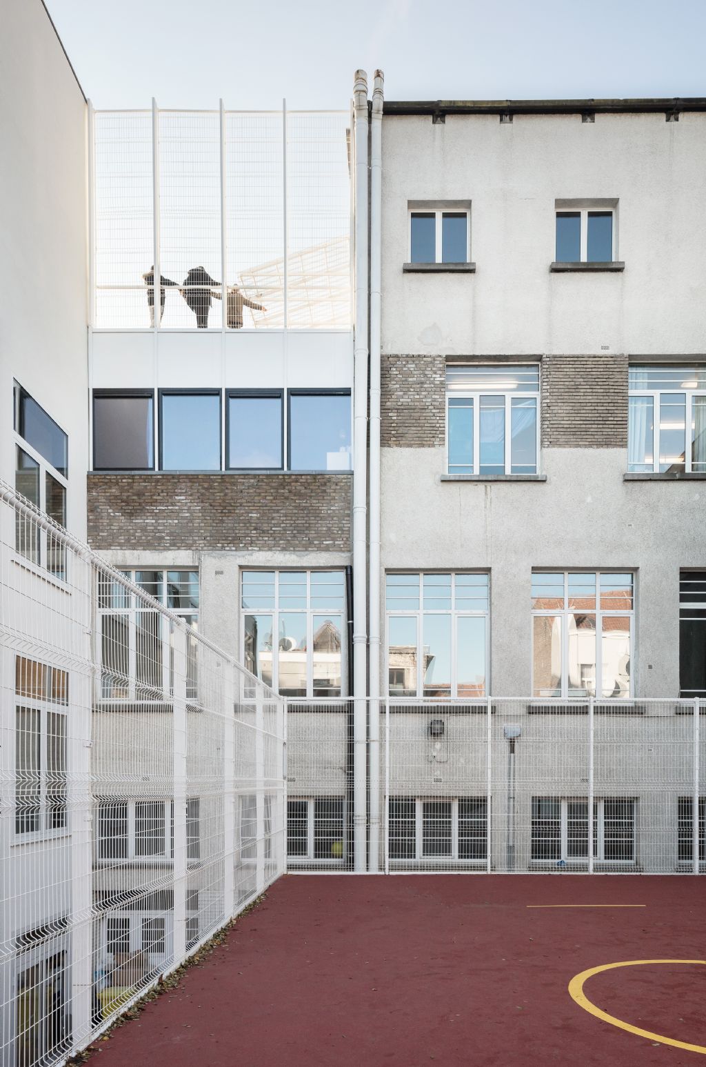 Ondanks zijn dense bebouwing worden er toch enkele uitzonderlijke ruimtes gecreëerd. Het ontdubbelen van de westelijke gevel zorgt voor een opwaardering van de bestaande klassen, terwijl het toevoegen van een klassencluster een dakterras mogelijk maakt met een indrukwekkend uitzicht. Zo worden de crèche en de school ook visueel geïntegreerd in de buurt. De 'tafel' zorgt dan weer voor een zeer efficiënte en ludieke speelstructuur waardoor een minimale ruimte een avontuurlijke speelplaats wordt.