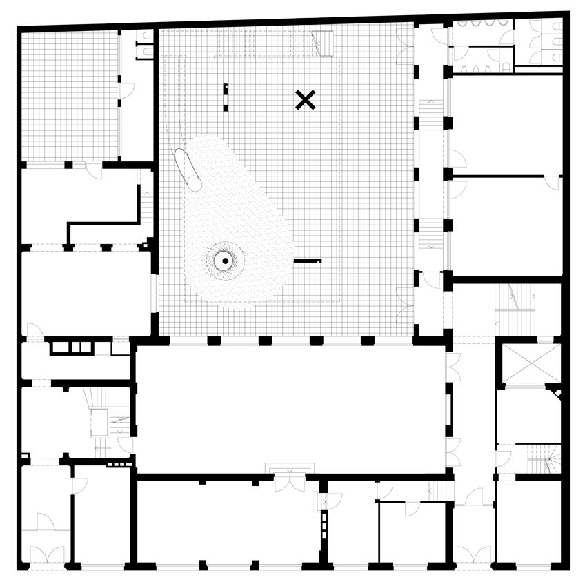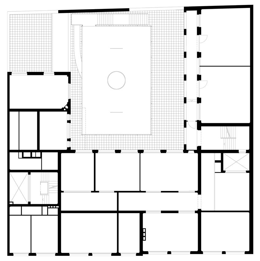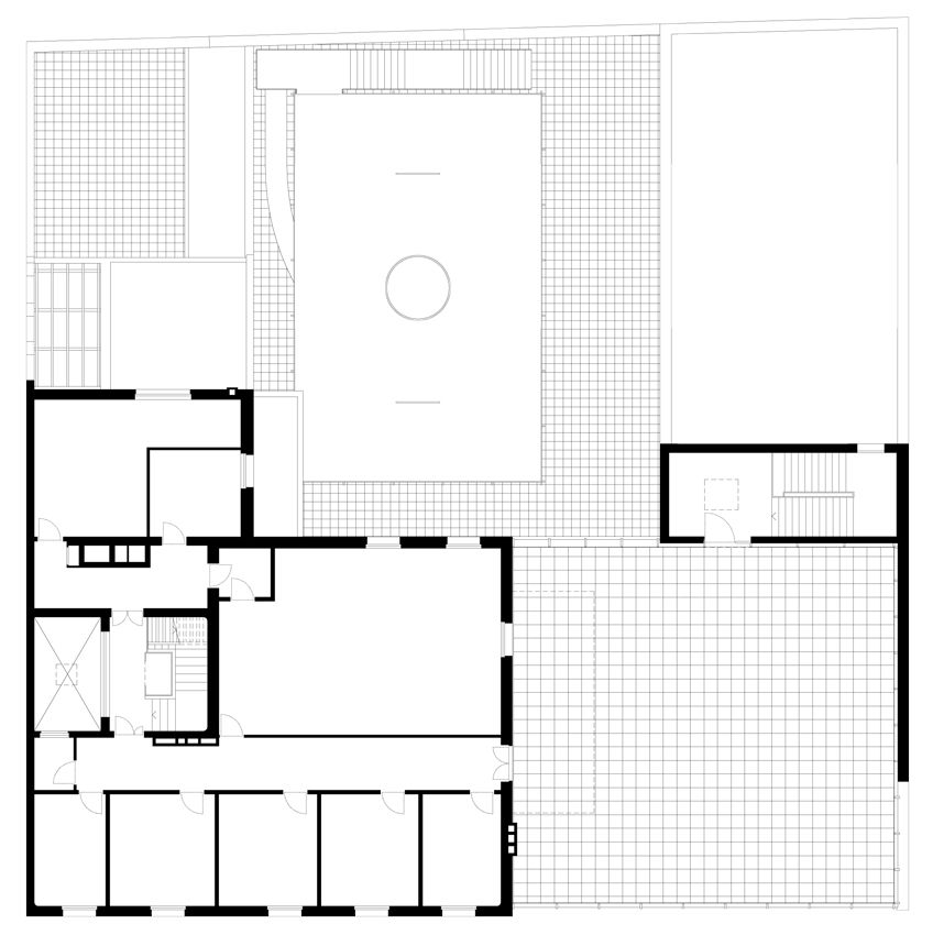 De eerste stap was het opvullen van de lege hoek tussen beide gebouwen. Door het invoegen van een klassencluster en dakterras met uitzicht op de benedenstad werden beide gebouwen verenigd. De lichte structuur van de borstwering van het dakterras voltooit en onderlijnt het silhouet van het geheel en zorgt tegelijkertijd voor een vloeiende overgang met de lagere buren.