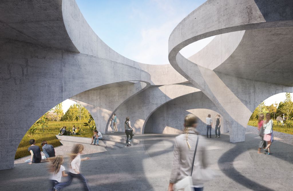 “De bogen werken als een constellatie van contrasten en tegenstellingen, van analoge en homogene relaties, van balans en spanning. Ze genereren verschillende associaties, zonder dat de individuele elementen hun identiteit en relatieve autonomie verliezen. Er wordt gestreefd naar een zekere coherentie, waarbij het beeld, dat tegelijk eigentijds en tijdloos is, gevoelsmatig bij de locatie gaat horen. De ambitie ligt in het vormen van een actueel beeld bij het aanwezige krachtige landschap. Het paviljoen wordt uitgevoerd in licht grijs beton in situ, de gevelopstanden van de pleisterplek en dierenverzorging worden in hout en glas gematerialiseerd. Beton vs. hout, monoliet vs. samengesteld, warm vs. koud, hard vs. zacht, zwaar vs. licht... enkel dualiteiten van de gebruikte materialen”, aldus Van Belle & Medina Architects.