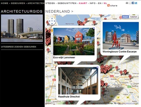Onlangs lanceerden ArchiNed en Uitgeverij 010 de websites architectuurgids.nl en architectureguide.nl. Deze websites geven toegang tot alle Nederlandse gebouwen en projecten die in de verschillende architectuurgidsen van Uitgeverij 010 zijn opgenomen. De online versie biedt veel nieuwe zoek- en selectiemogelijkheden. De ruim 1500 projecten zijn terug te vinden op de kaart van Nederland met streetview en waarbij gewisseld kan worden tussen een kaart- of een satellietbeeld.