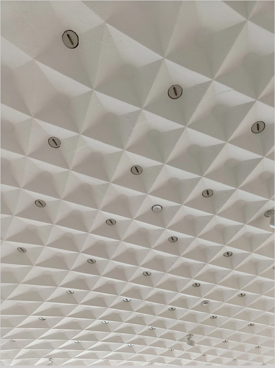 Ook de plafonds in Vleugel 19 zijn indrukwekkend. ‘De plafonds zijn heel uniek', vertelt Mutert. ‘We hebben toen even moeten uitdokteren hoe we de diamanten plafonds praktisch zouden uitvoeren. Uiteindelijk hebben we een bekisting gebruikt uit piepschuim die 3D gefreesd was, zodat je eigenlijk een soort 3D-puzzel kreeg waarop de laag beton werd uitgespreid. Achteraf werd het piepschuim dan verwijderd om de onderzijde van het plafond zichtbaar te maken. Voor het museum was het belangrijk dat er verschillende mogelijkheden waren om tentoonstellingsruimtes te belichten, en dus moest er in elk diamantje een elektrische voorziening ingebouwd worden om achteraf eventueel een spotje in te kunnen steken. We moesten dus tijdens de uitvoering perfect op de juiste plaats van die diamanten de juiste kabels doorvoeren.’