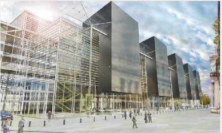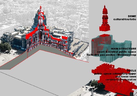 Tot slot vielen ook Pierre Silande en Mickael Papin nog in de prijzen. Het Franse duo vat het justitiepaleis op als een symbolische openbare ruimte die de beneden- en de bovenstad met elkaar verbindt. Rondom het gebouw zou een concentratie van woningen, kantoren en handelszaken komen.