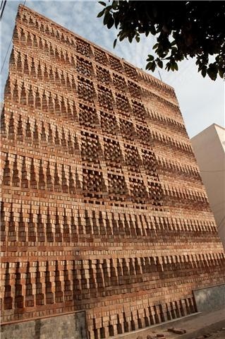 Het praktische design en de creativiteit die in het nieuwe kantoorgebouw van de South Asian Human Rights Documentations Centers (SAHRDC) in Delhi zitten, maken er een buitengewoon, poëtisch bouwwerk van. Het architectenduo Valbhav Dimri en Madhav Raman had maar 50 vierkante meter oppervlakte en een beperkt budget ter beschikking, maar ontwikkelde toch een wat ruimte betreft efficiënte en betaalbare kantoorruimte. Belangrijk daarbij was dat de mensen die er werkten geen last zouden hebben van het lawaai, de invloeden op straat en de invallende zon. Dit lukte hen doordat ze de voor de rest minimalistische buitenkant aan de langste zijwand met een extravagante bakstenen gevel opdeelden. Ze vonden hun inspiratie in de traditionele bouwkunst om een unieke, terugkerende bakstenen module met een optisch erg complex patroon te creëren. Daarbij verwijzen ze naar de prachtig uitgesneden zonweringen (jali’s) die in de Indische architectuur een lange traditie kennen. Ze werkten met gevelstenen van 230 x 115 x 75 mm, de standaardmaat in India. Aan deze prachtig uitziende gevel gingen vijf weken studie en bijscholing vooraf. Op de bouwwerf zelf kwam er dan nog heel wat geëxperimenteer met inlegtechnieken aan te pas. De golvende structuur van de wand is een mooi voorbeeld van welke unieke, architectonische effecten mogelijk zijn wanneer de eenvoudige vorm van de baksteen de weg wijst en met zijn eigen typische kenmerken automatisch behoorlijk complexe patronen, structuren en openingen legt.
