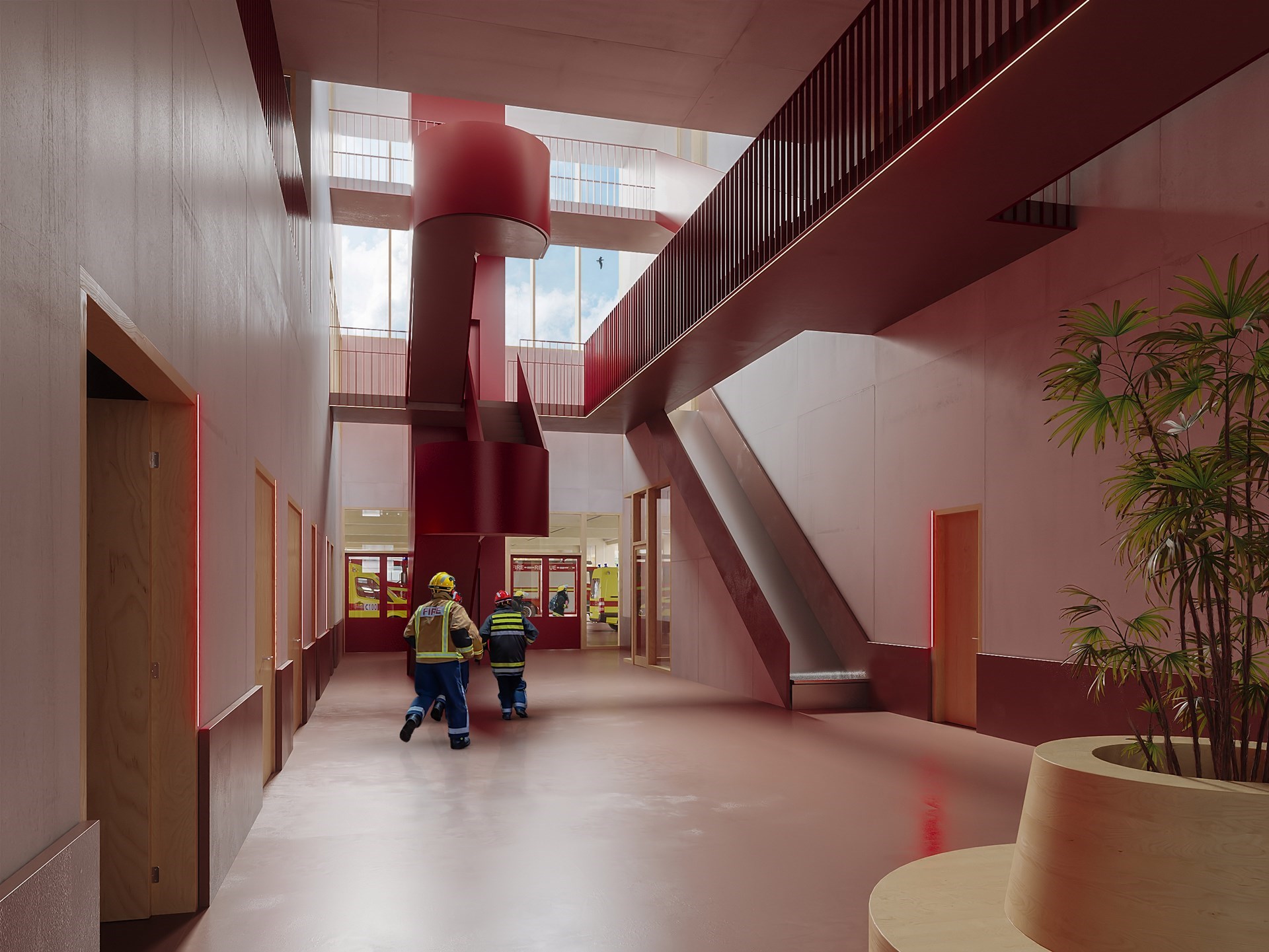 Een dubbelhoge, verbindende binnenstraat vormt de ruimtelijke en functionele link tussen de verschillende programma onderdelen van de kazerne: ontvangst & interventie, werkplaatsen & opslag, verblijfs- & rustruimten, administratie & ontspanningsplekken. De binnenstraat vormt één centrale as met de grote parkeergarage, waardoor een snelle en functionele flow gegarandeerd wordt.